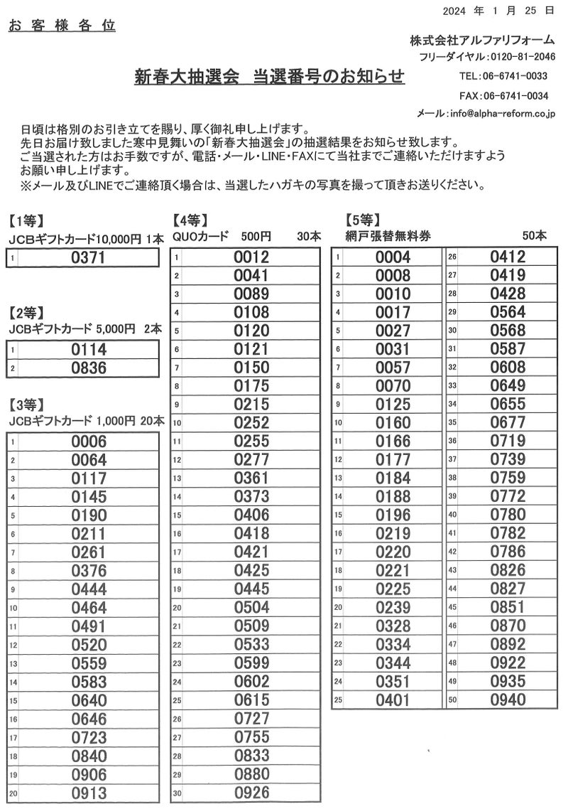 寒中見舞い【新春大抽選会 当選番号発表!】