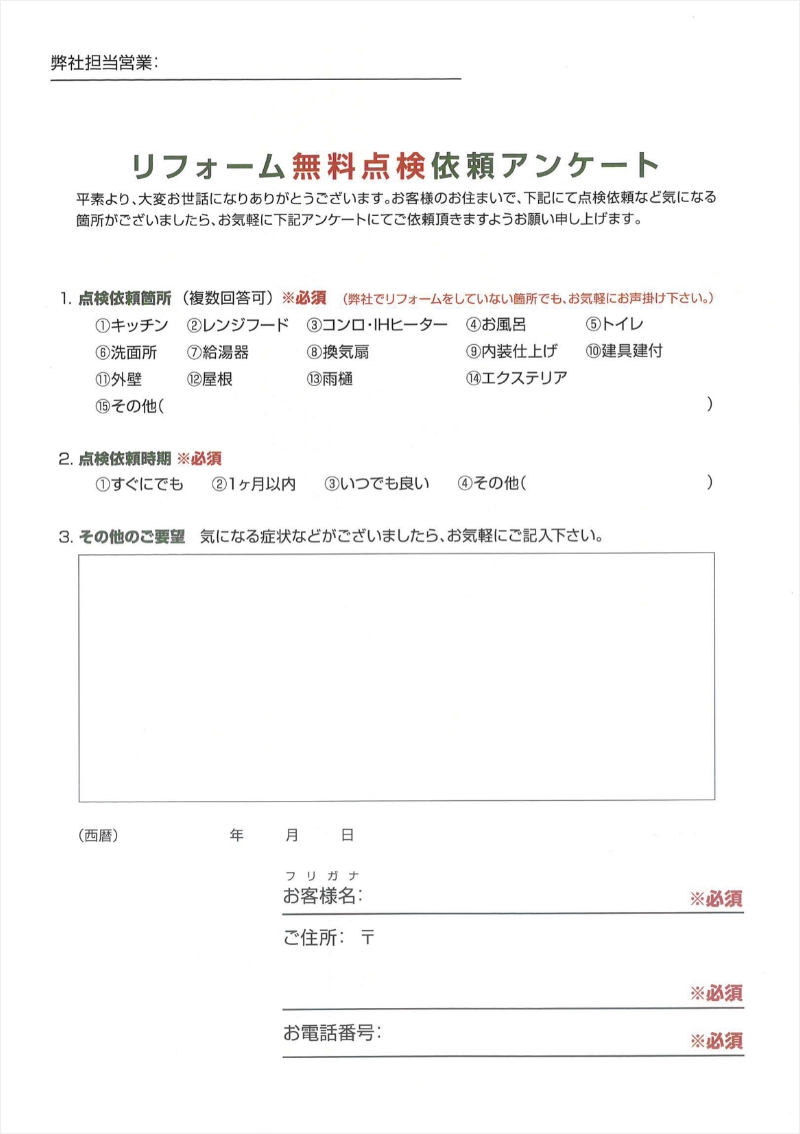 リフォーム工事無料点検依頼アンケートFREE INSPECTION REQUEST アルファリフォームでは、リフォームさせて頂いたお客様へ無料点検をご依頼いただくためのアンケートを行っております。 CONTENTS お見積前アンケート お客様へのお約束 自社工事保証書の発行 リフォーム瑕疵保証 住宅設備機器延長保証(あんしん修理サポート) 加入保険 工事後アンケート お伺いはがき 工事後のお客様とのコミュニケーション リフォーム工事無料点検依頼アンケート