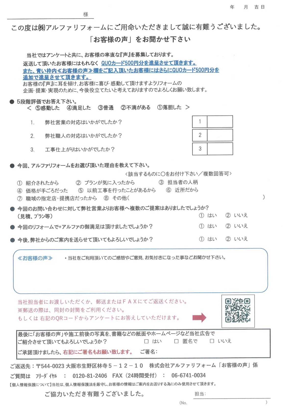 工事後アンケートQUESTIONNAIRE アルファリフォームでは、工事が終わった後からが本当のお付き合いと考えています。工事後のアンケートを頂く事でお客様の生の声を頂戴し、よりよいリフォームの向上に活用させていただいています。 工事後アンケートフォームはこちら 工事後アンケート用紙の ダウンロードはこちら お客様の声はこちら CONTENTS お見積前アンケート お客様へのお約束 自社工事保証書の発行 リフォーム瑕疵保証 住宅設備機器延長保証(あんしん修理サポート) 加入保険 工事後アンケート お伺いはがき 工事後のお客様とのコミュニケーション リフォーム工事無料点検依頼アンケート