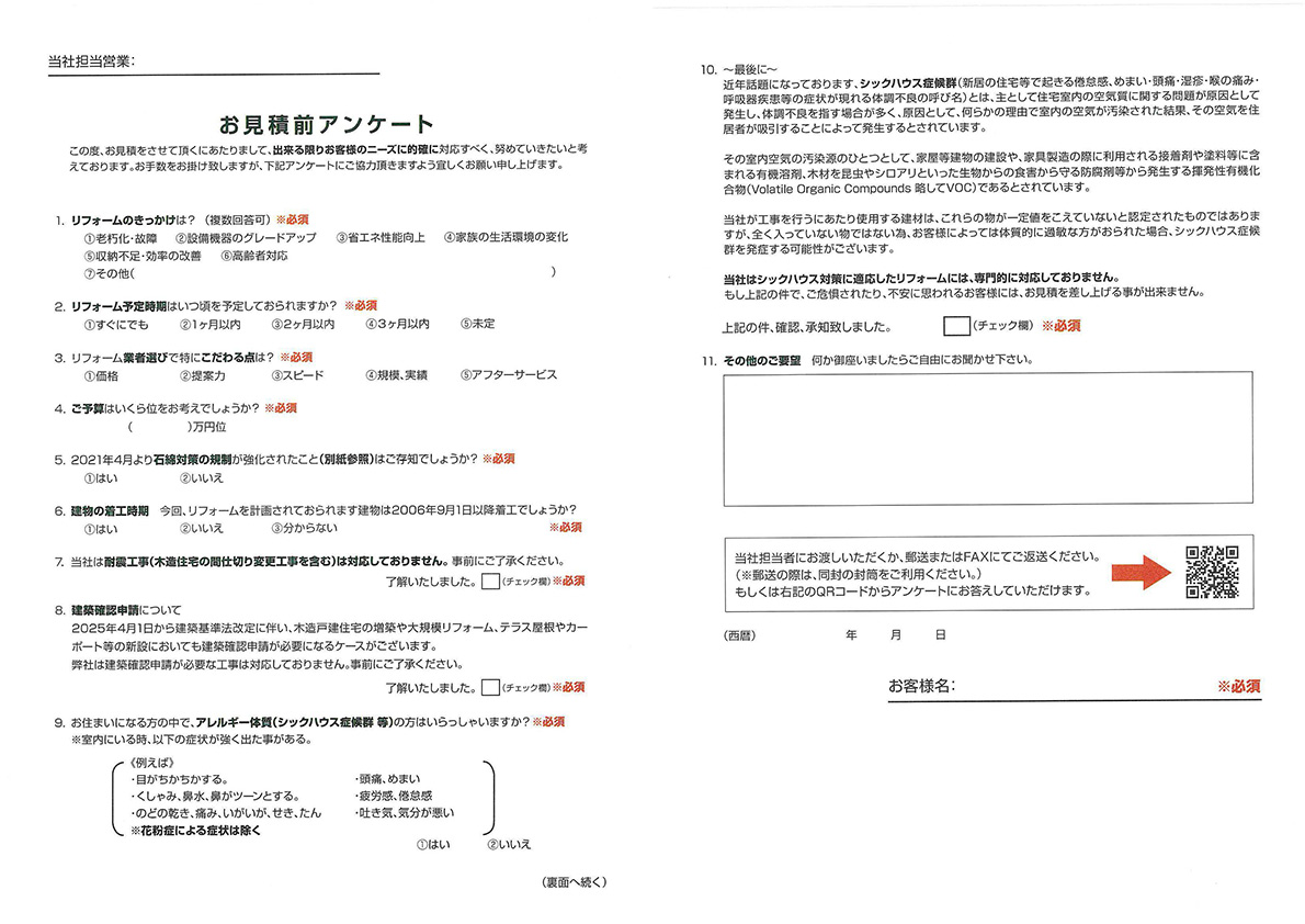 お見積前アンケートQUESTIONNAIRE BEFORE アルファリフォームでは、出来る限りお客様のニーズに的確に対応すべく、お見積前アンケートを⾏なっております。 お見積前アンケートフォームはこちら CONTENTS お見積前アンケート お客様へのお約束 自社工事保証書の発行 リフォーム瑕疵保証 住宅設備機器延長保証(あんしん修理サポート) 加入保険 工事後アンケート お伺いはがき 工事後のお客様とのコミュニケーション リフォーム工事無料点検依頼アンケート
