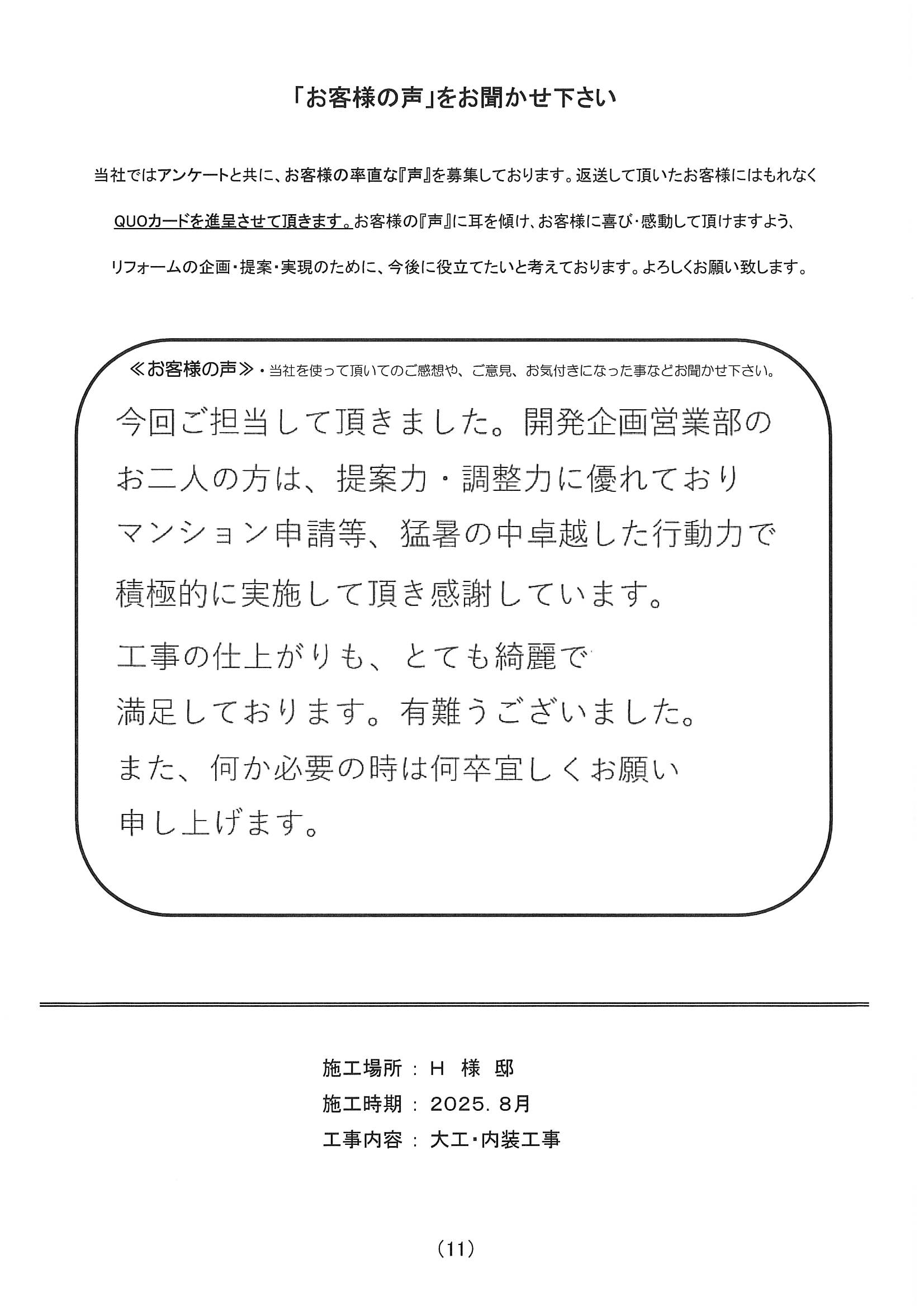 今回ご担当して頂きました。開発企画営業部のお二人の方は、提案力・調整力に優れておりマンション申請等、猛暑の中卓越した行動力で積極的に実施して頂き感謝しています。工事の仕上がりも、とても綺麗で満足しております。有難うございました。また、何か必要な時は何卒宜しくお願い申し上げます。