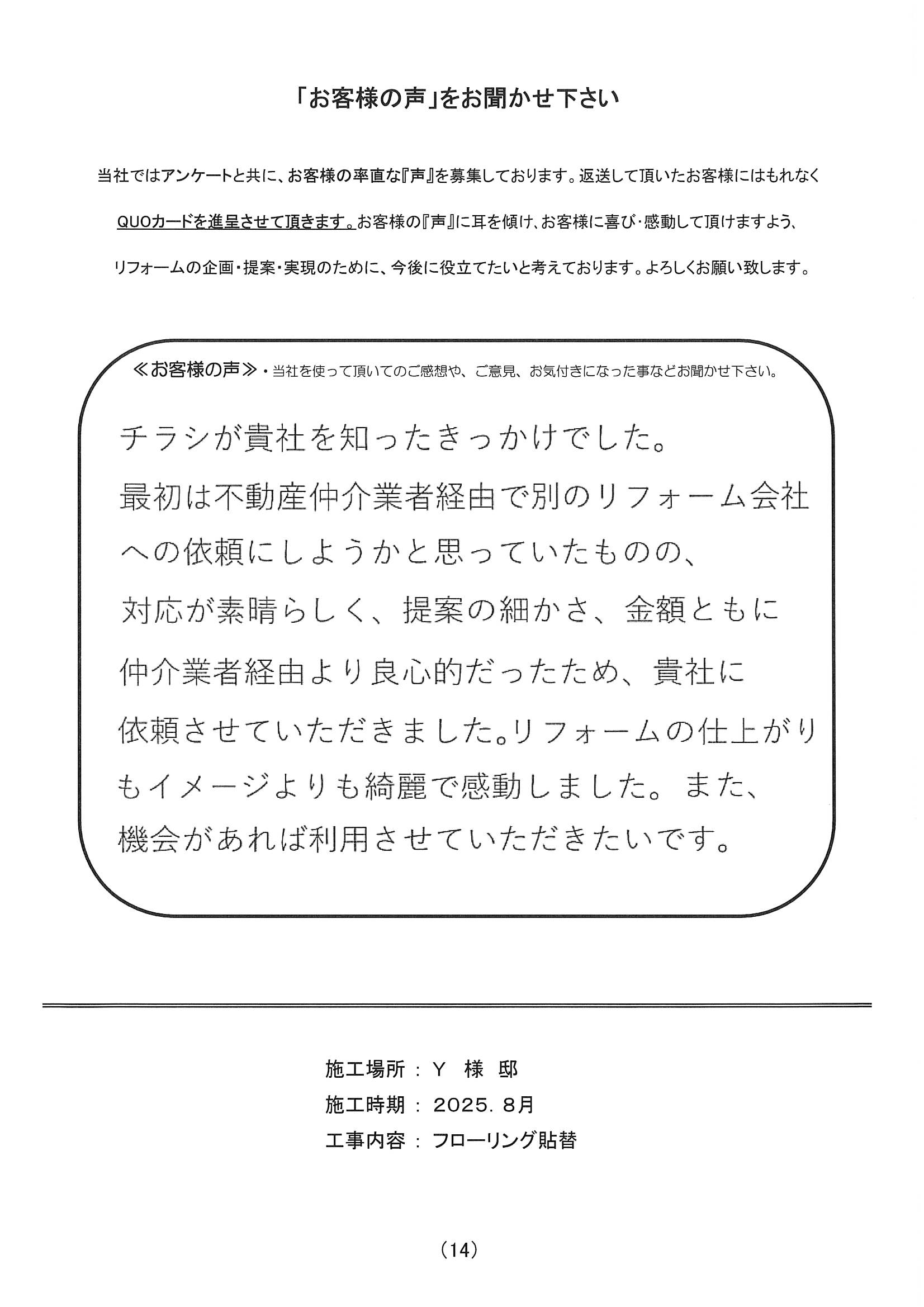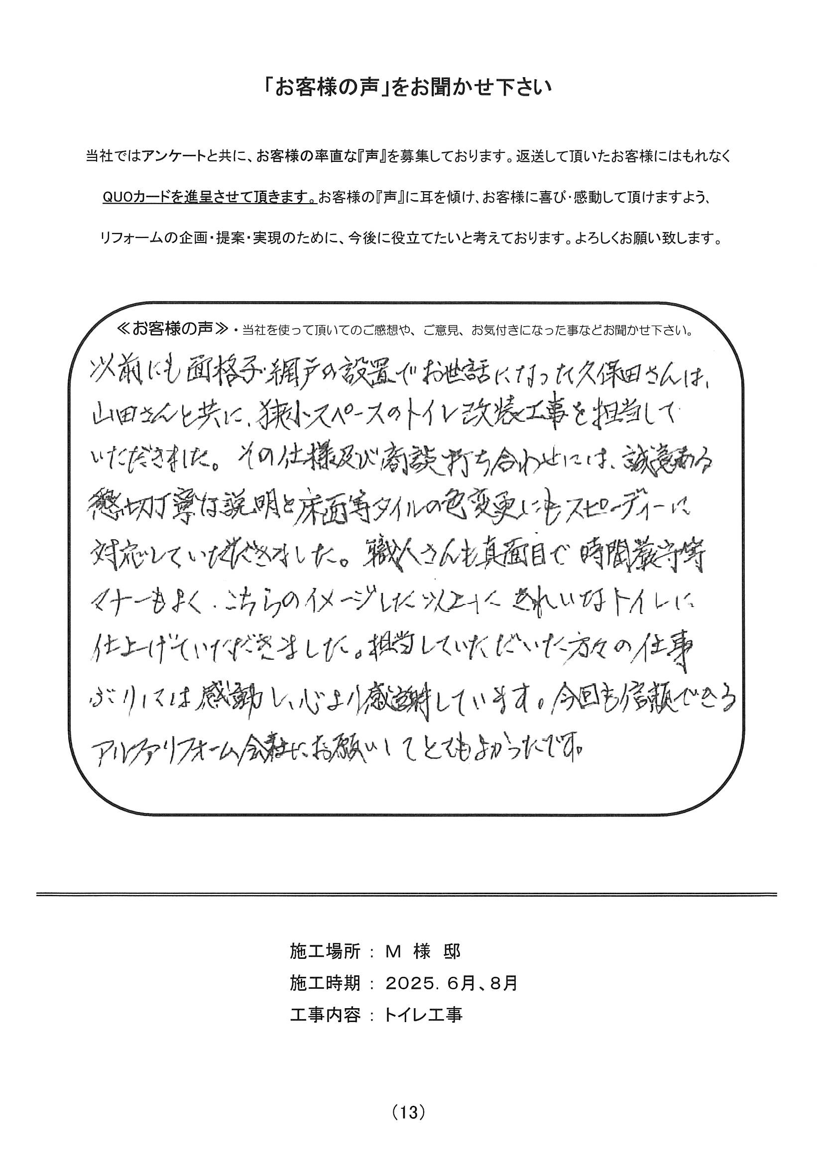 お客様よりアルファリフォームに届いたアンケートの一部をご紹介させて頂きます。