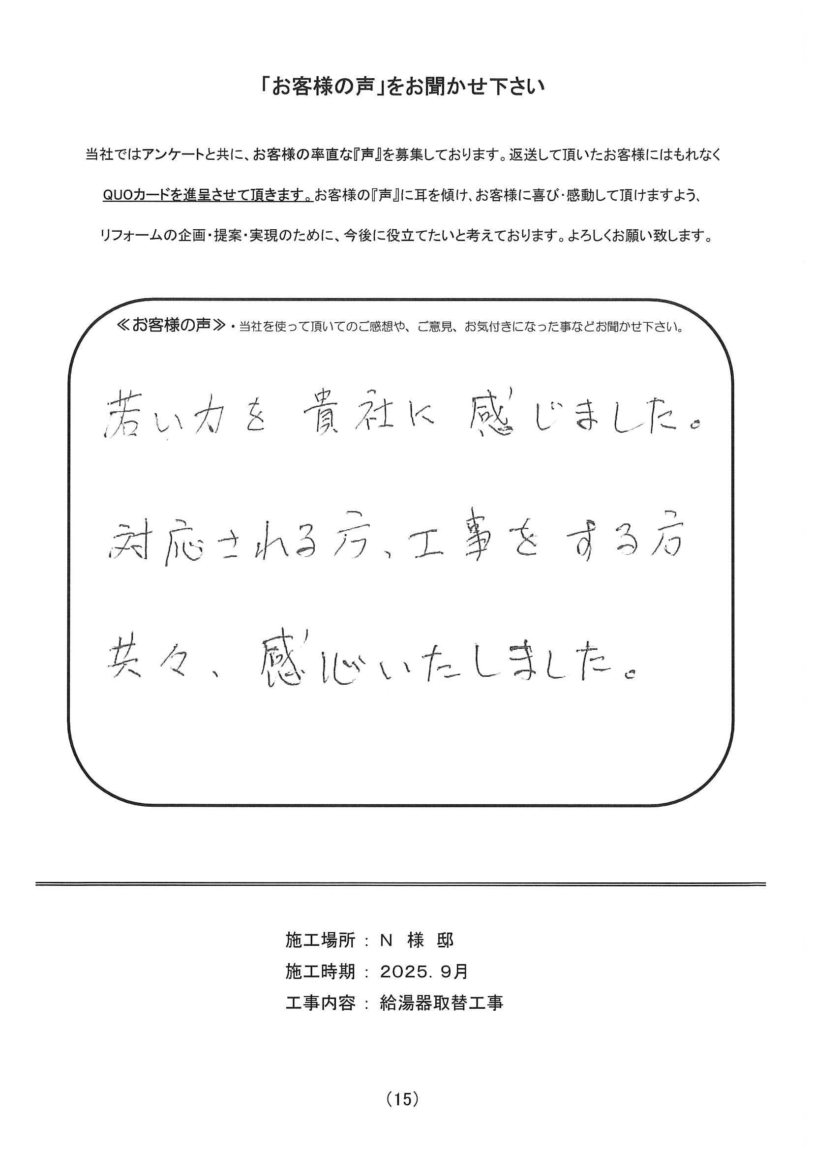 若い力を貴社に感じました。対応される方、工事をする方共々、感心いたしました。