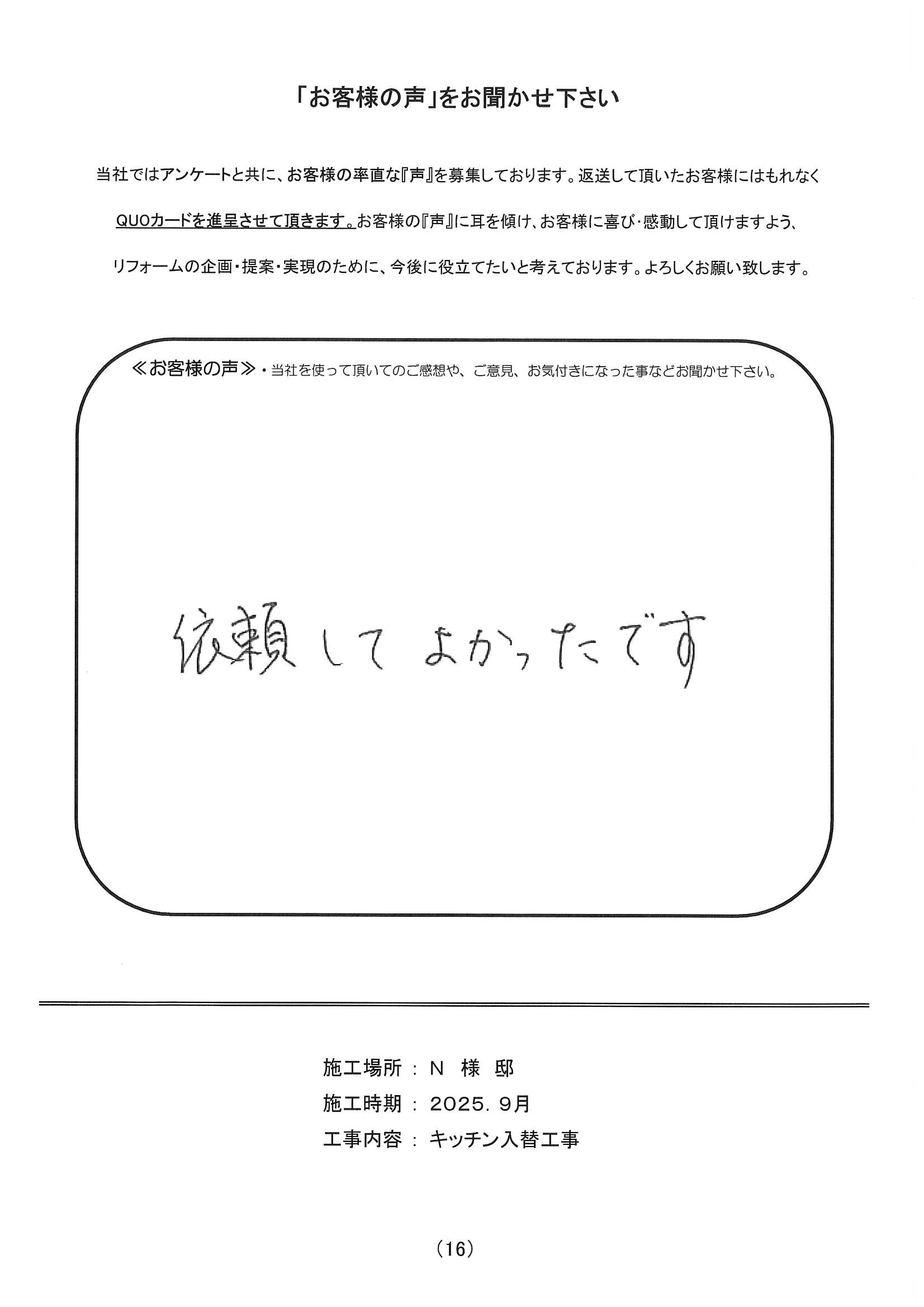 施工場所 N様邸 住宅形態 戸建て 施工時期 2025年9月 工事内容 キッチン入替工事