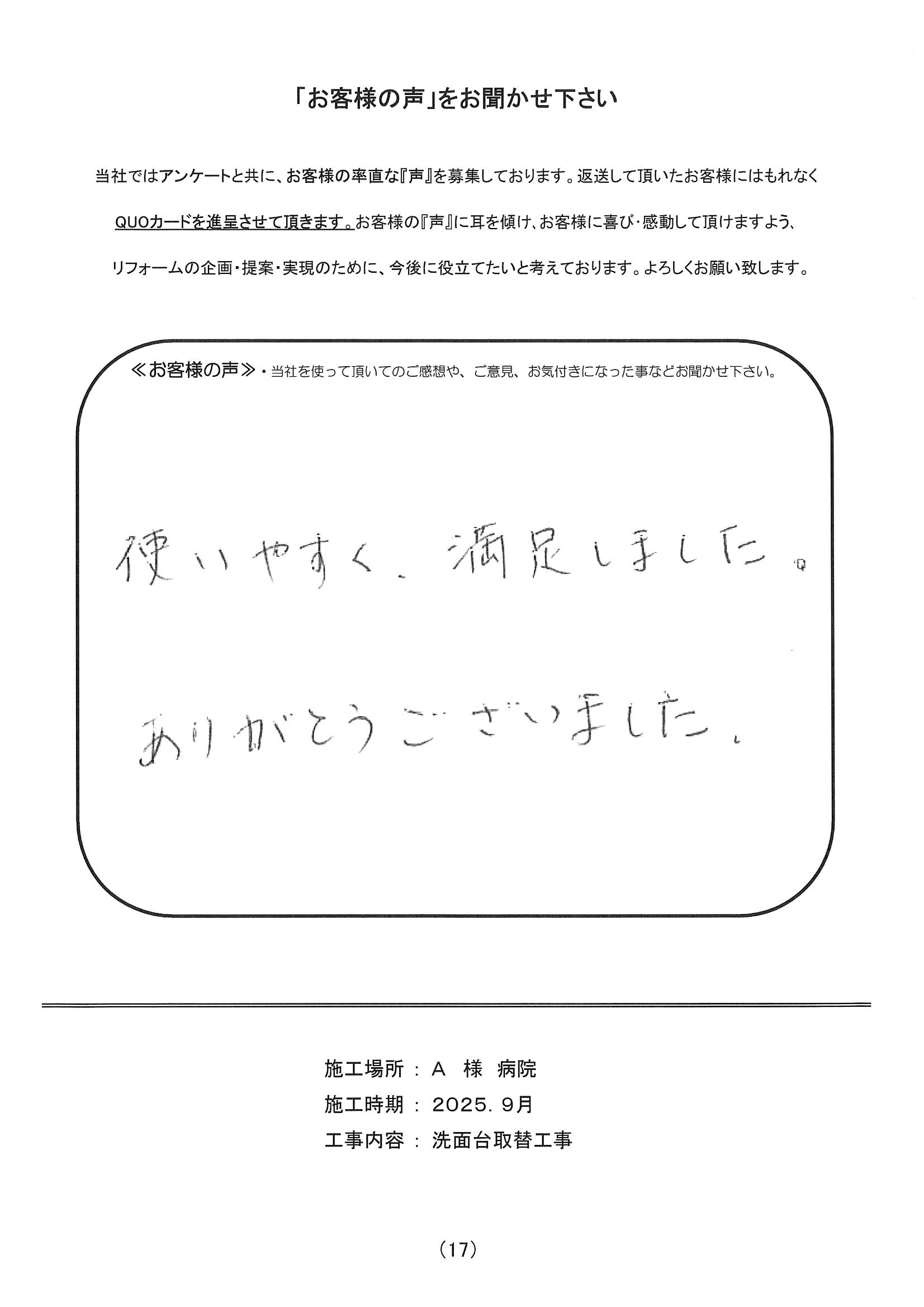 施工場所 A病院 住宅形態 病院 施工時期 2025年9月 工事内容 洗面台取替工事
