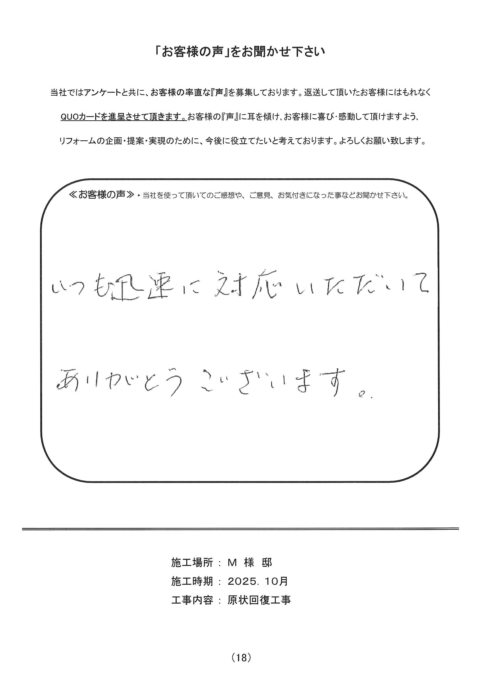 施工場所 M様邸 住宅形態 マンション 施工時期 2025年10月 工事内容 原状回復工事