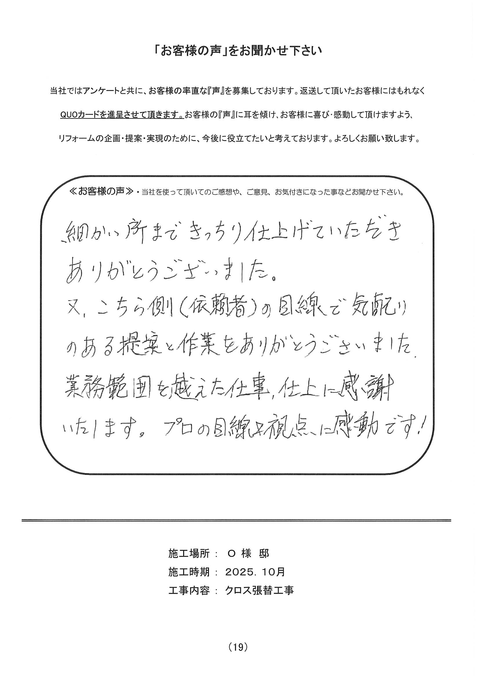 施工場所 O様邸 住宅形態 戸建て 施工時期 2025年10月 工事内容 クロス張替工事