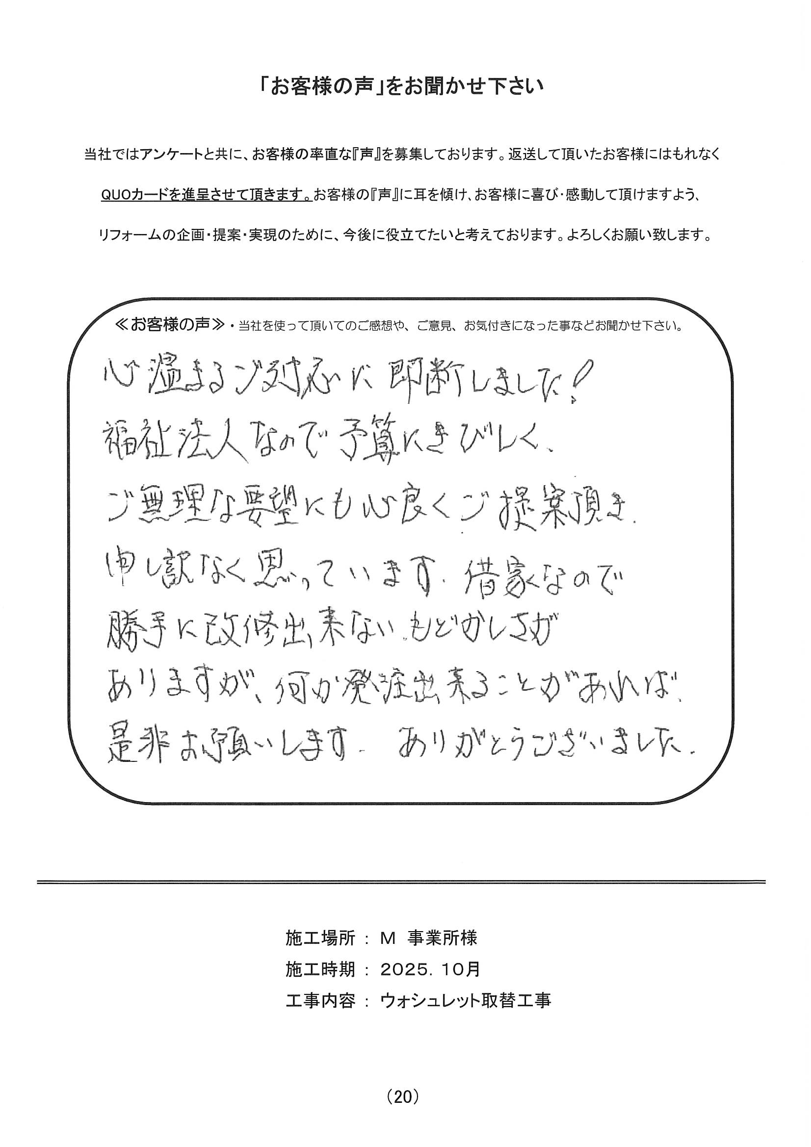 施工場所 M事業所 住宅形態 事業所 施工時期 2025年10月 工事内容 ウォシュレット取替工事
