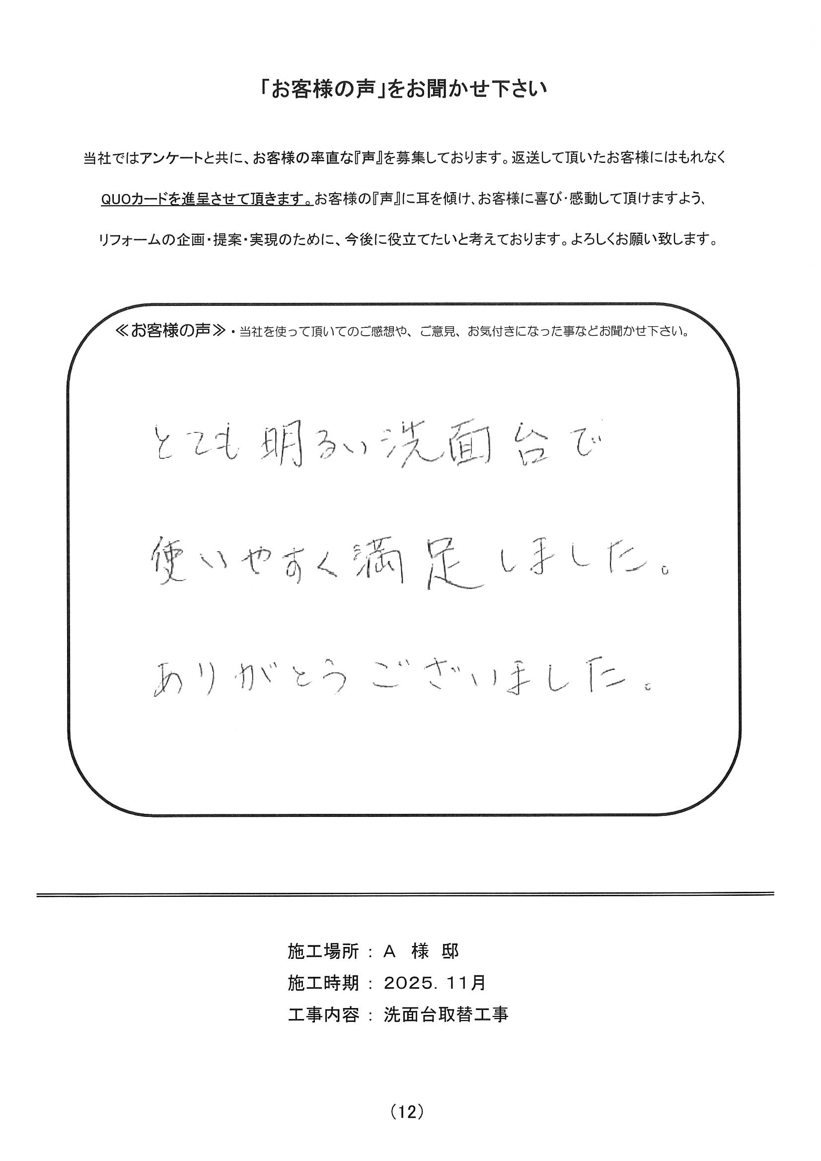 施工場所 A様邸 住宅形態 戸建て 施工時期 2025年11月 工事内容 洗面台取替工事