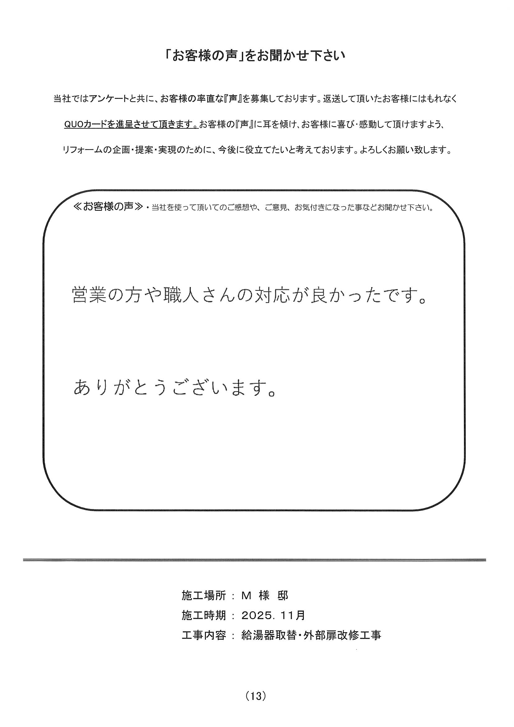 施工場所 M様邸 住宅形態 戸建て 施工時期 2025年11月 工事内容 給湯器取替・外部扉改修工事