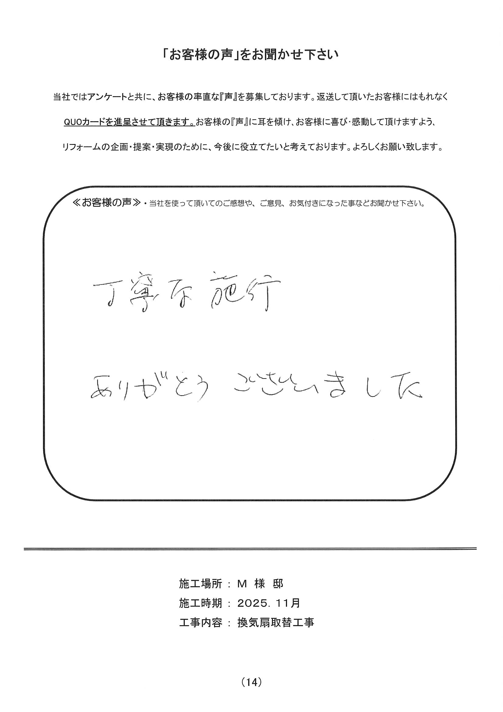 施工場所 M様邸 住宅形態 戸建て 施工時期 2025年11月 工事内容 換気扇取替工事