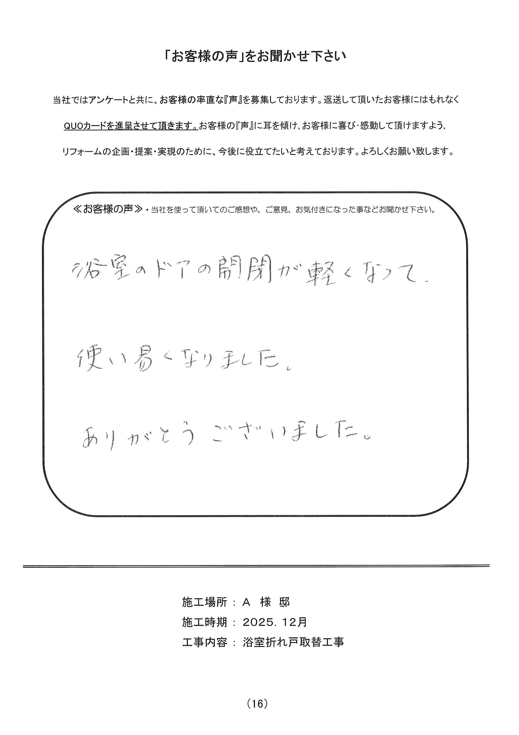 施工場所 A様邸 住宅形態 戸建て 施工時期 2025年12月 工事内容 浴室折れ戸取替工事