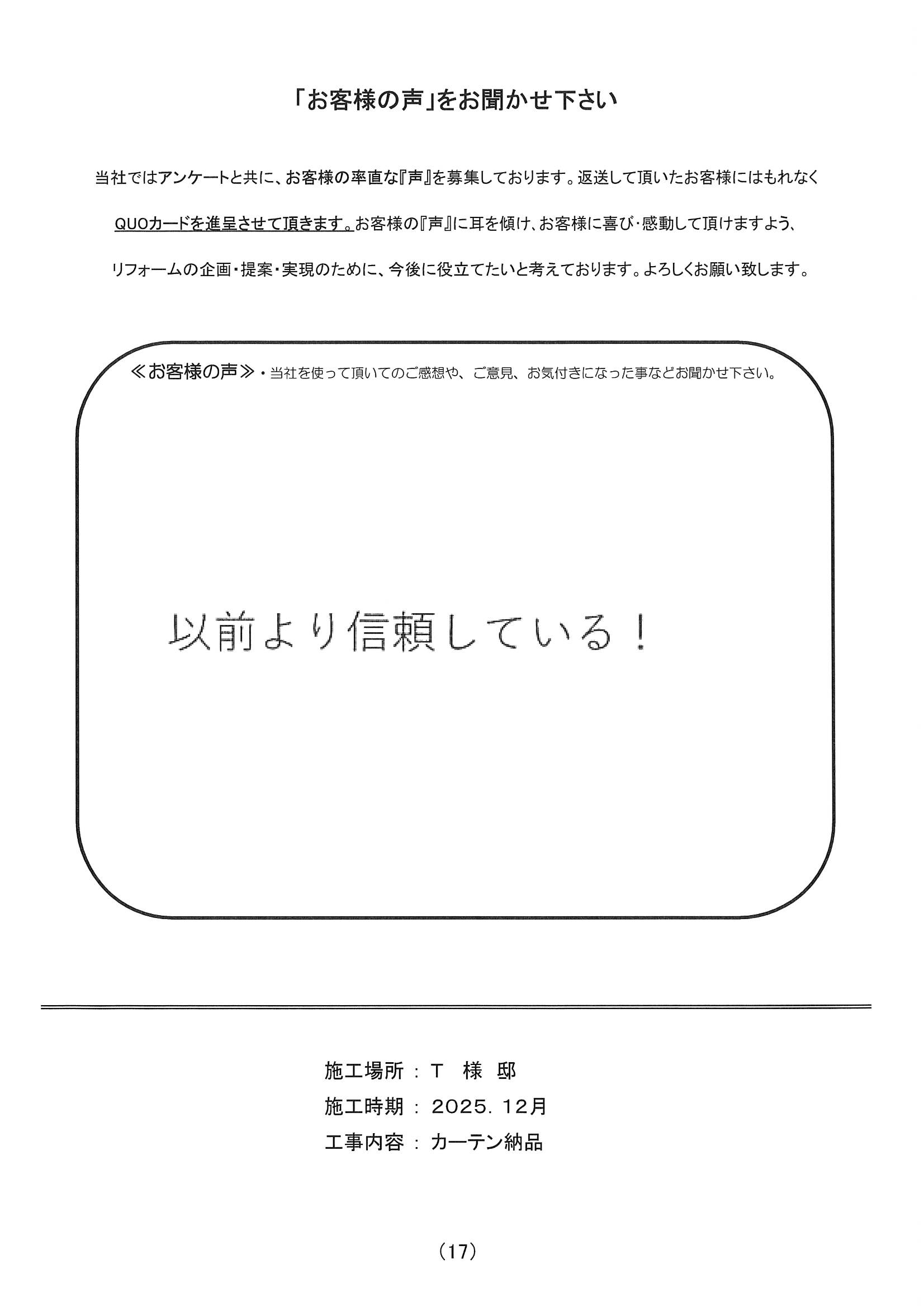 アルファリフォームを使って頂いたご感想・他店との違いなどを記入していただきました。