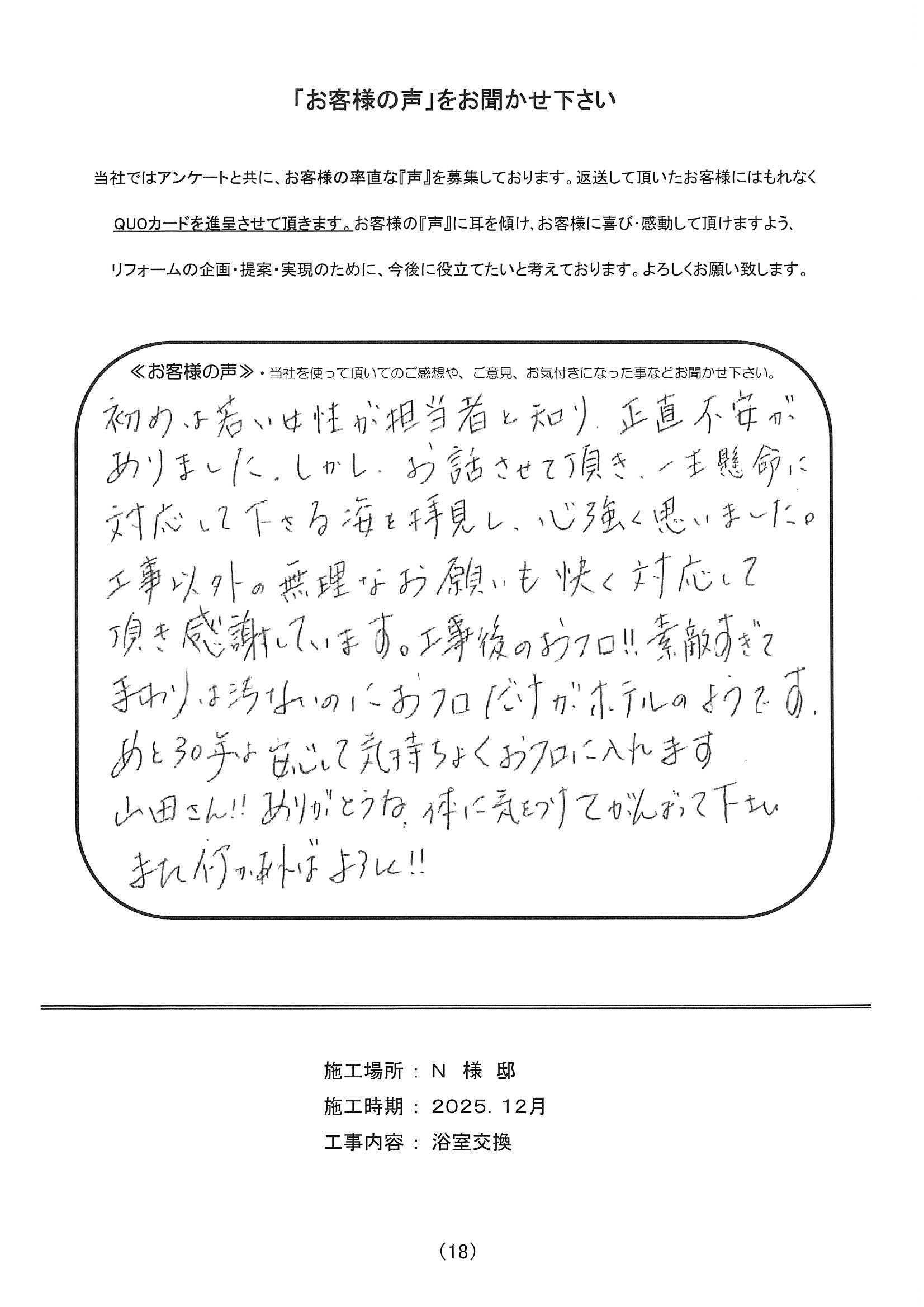 初めは若い女性が担当者と知り、正直不安がありました。しかし、お話させて頂き、一生懸命に対応して下さる姿を拝見し、心強く思いました。工事以外の無理なお願いも快く対応して頂き感謝しています。工事後のおフロ!!素敵すぎてまわりは汚いのにおフロだけがホテルのようです。あと30年は安心して気持ちよくおフロに入れます。山田さん!!ありがとうね。体に気をつけてがんばってください。また何かあればよろしく!!