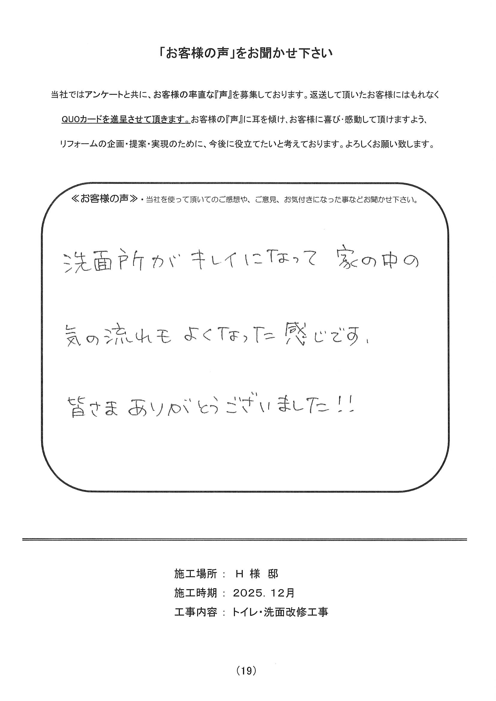 洗面所がキレイになって家の中の気の流れもよくなった感じです。皆さまありがとうございました!!