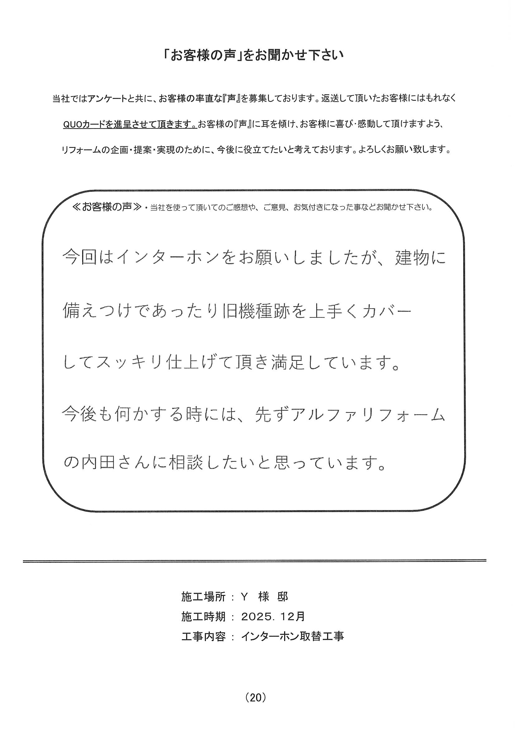 今回はインターホンをお願いしましたが、建物に備えつけであったり旧機種跡を上手くカバーしてスッキリ仕上げて頂き満足しています。今後も何かする時には、先ずアルファリフォームの内田さんに相談したいと思っています。