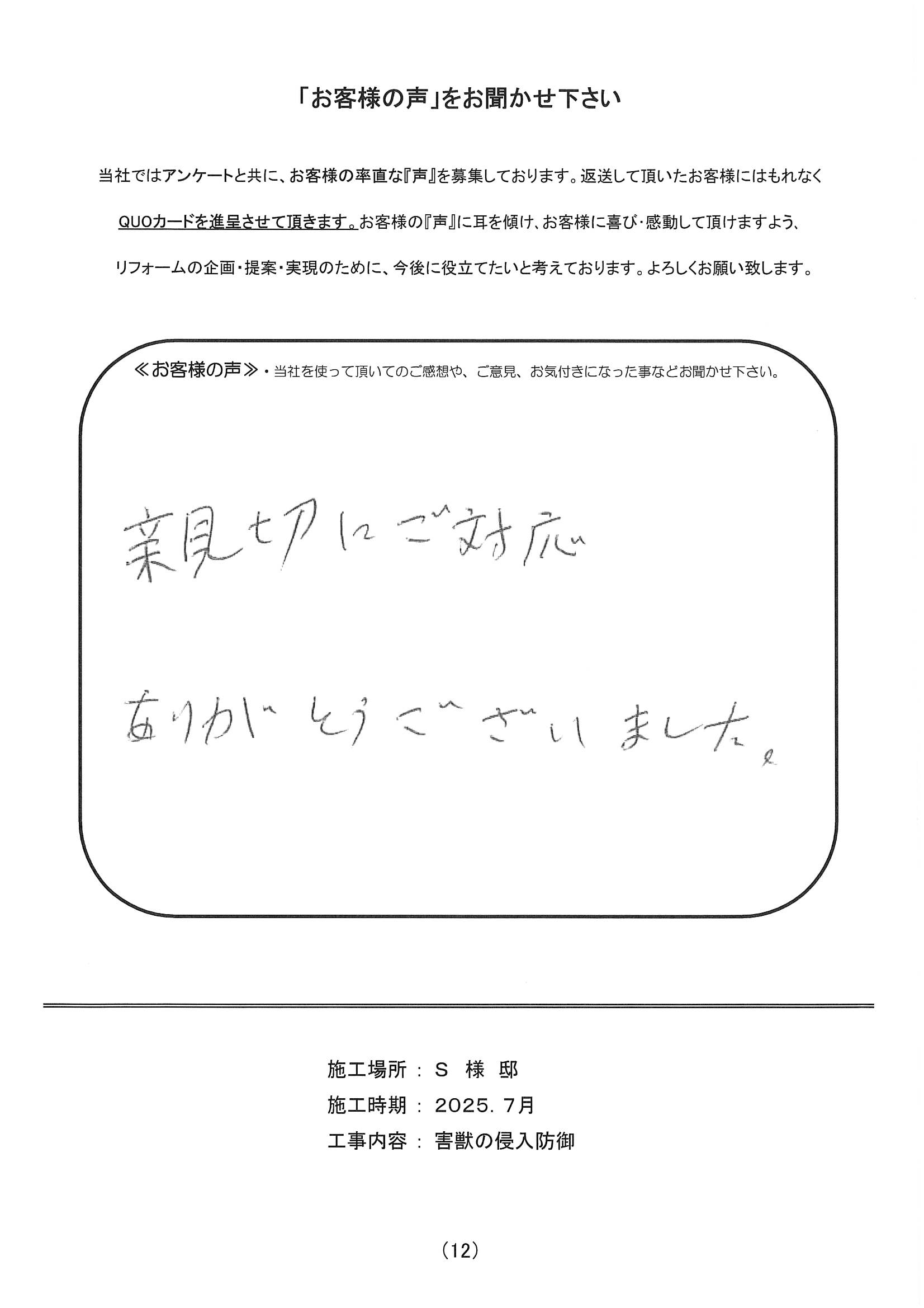 施工場所 S様邸 住宅形態 戸建て 施工時期 2025年7月 工事内容 害獣の侵入防御