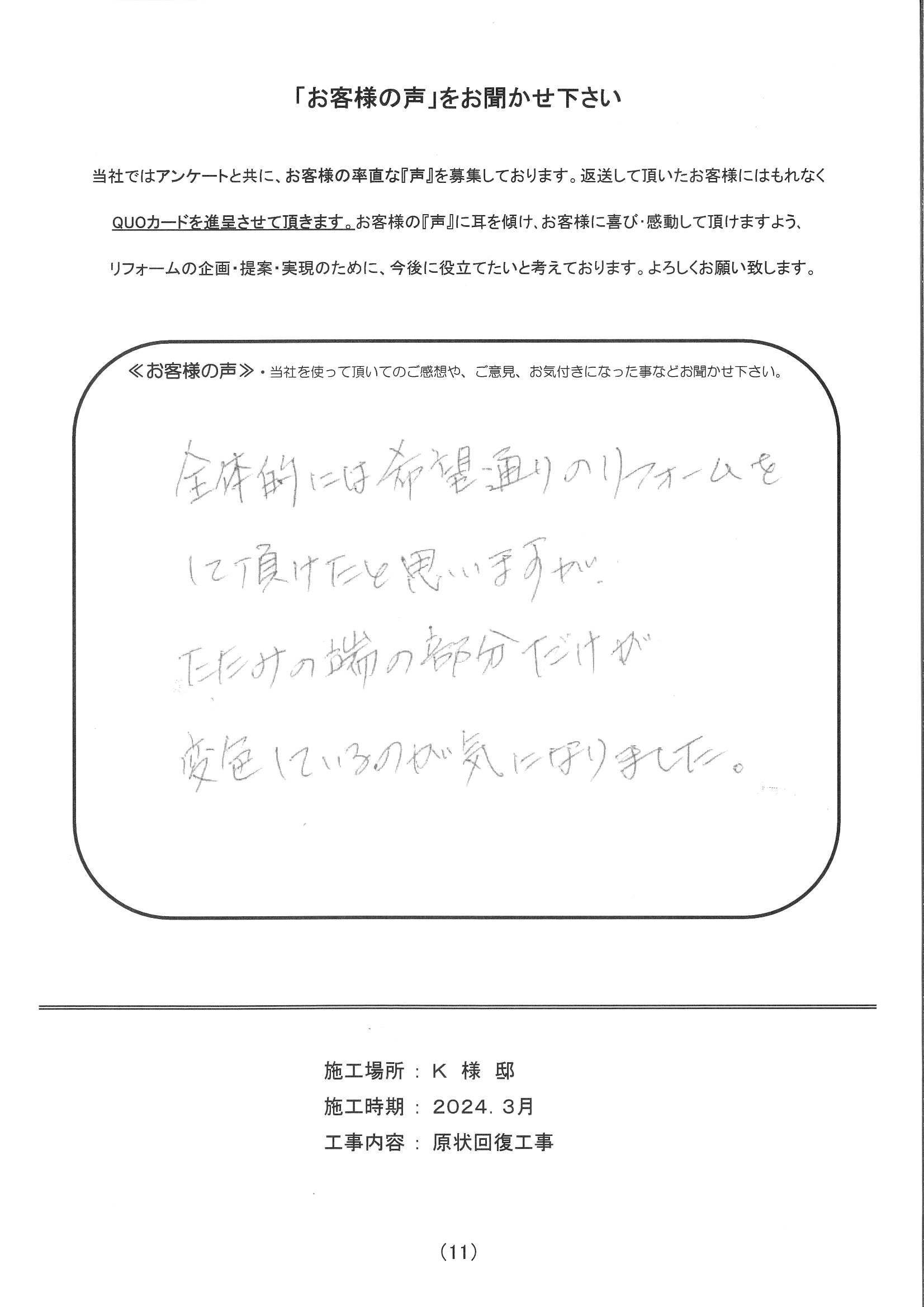 施工場所 K様邸 住宅形態 マンション 施工時期 2024年3月 工事内容 原状回復工事