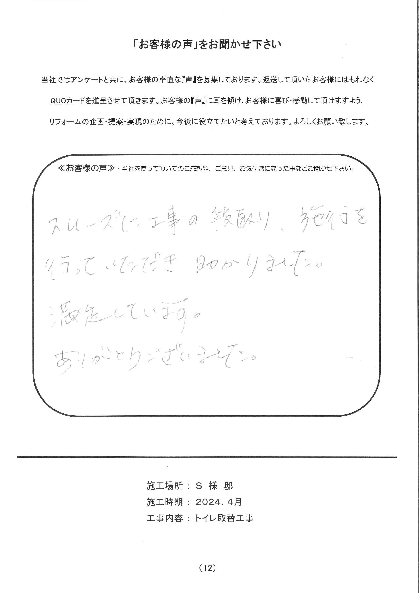 施工場所 S様邸 住宅形態 戸建て 施工時期 2024年4月 工事内容 トイレ取替工事