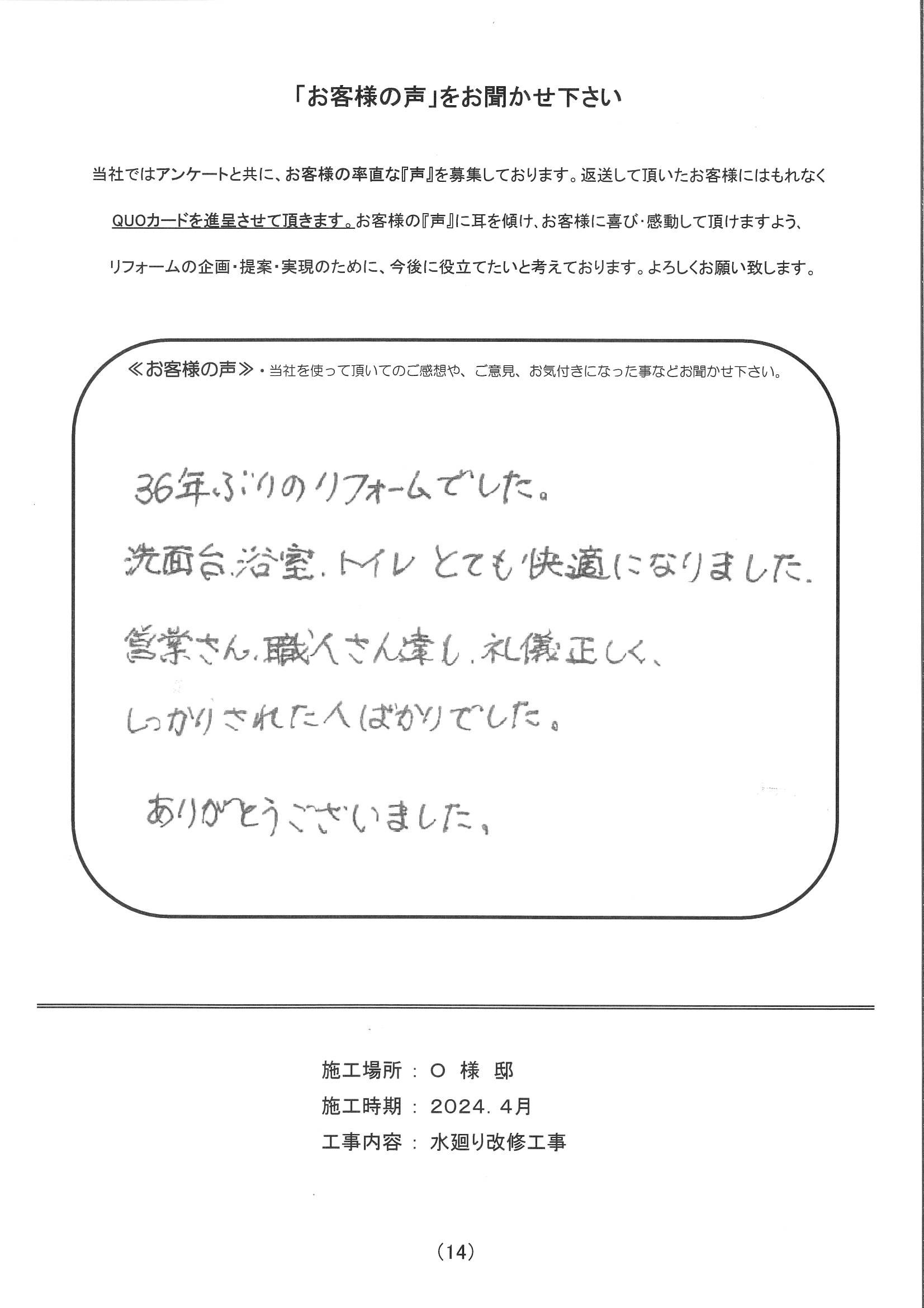 36年ぶりのリフォームでした。洗面台、浴室、トイレとても快適になりました。営業さん、職人さん達も礼儀正しく、しっかりされた人ばかりでした。ありがとうございました。