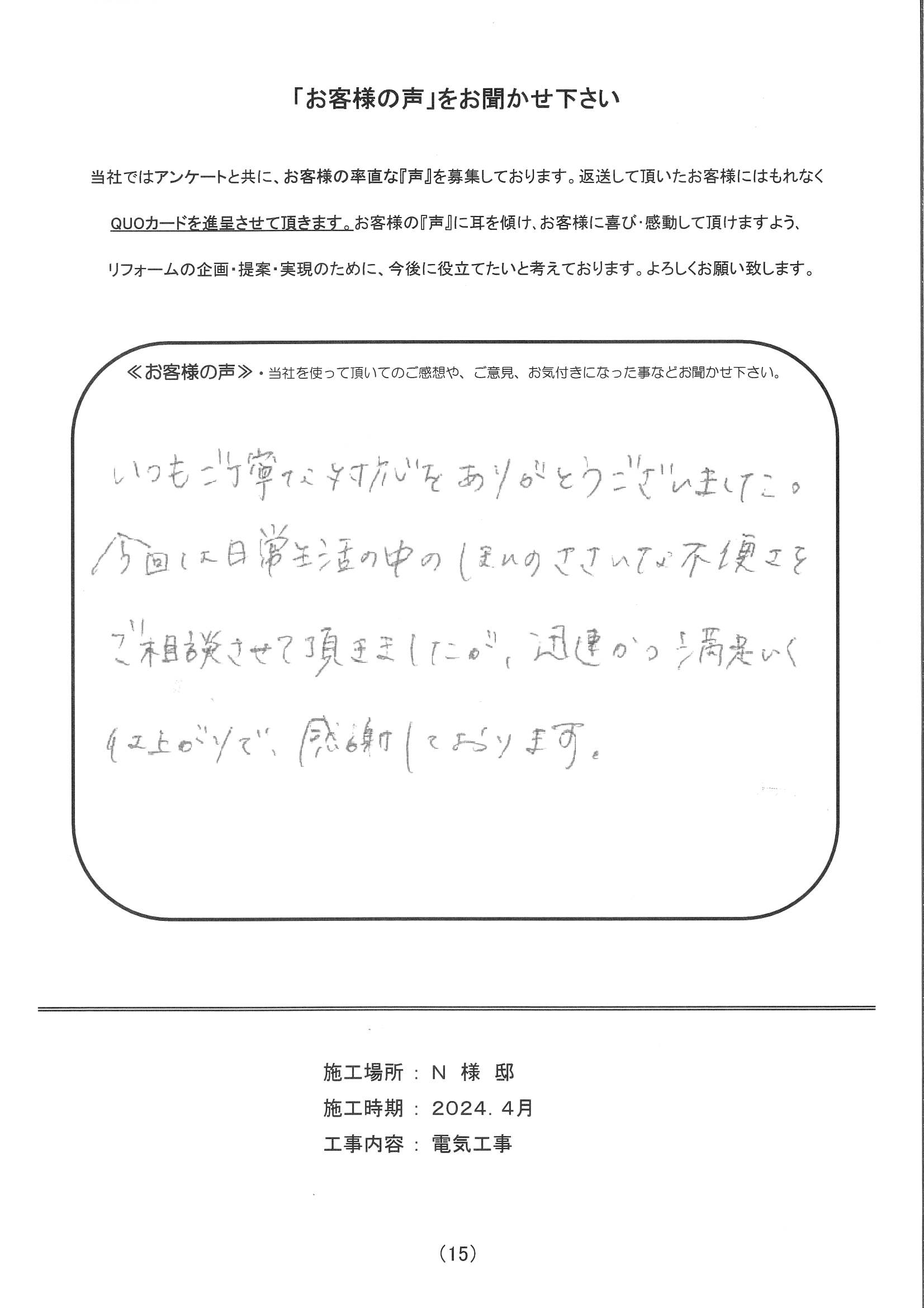 施工場所 N様邸 住宅形態 マンション 施工時期 2024年4月 工事内容 電気工事