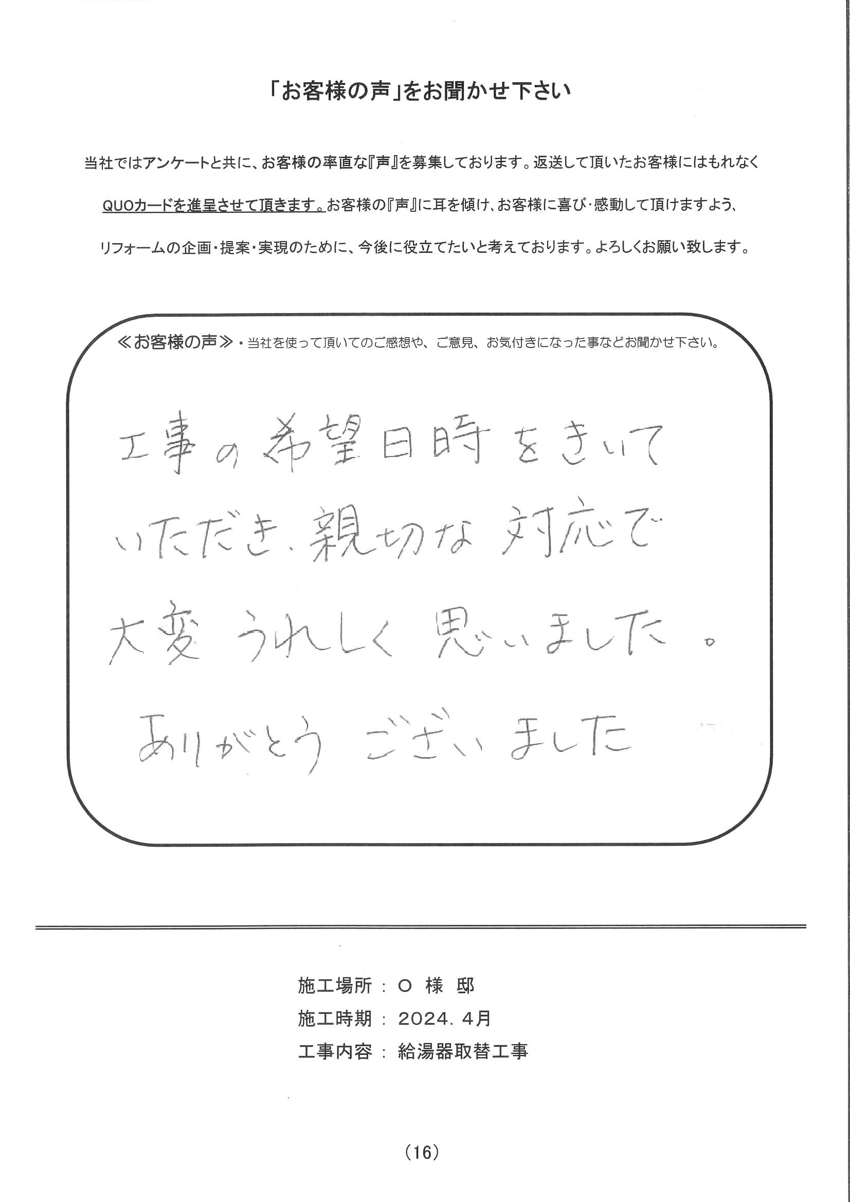 工事の希望日時をきいていただき、親切な対応で大変うれしく思いました。ありがとうございました。