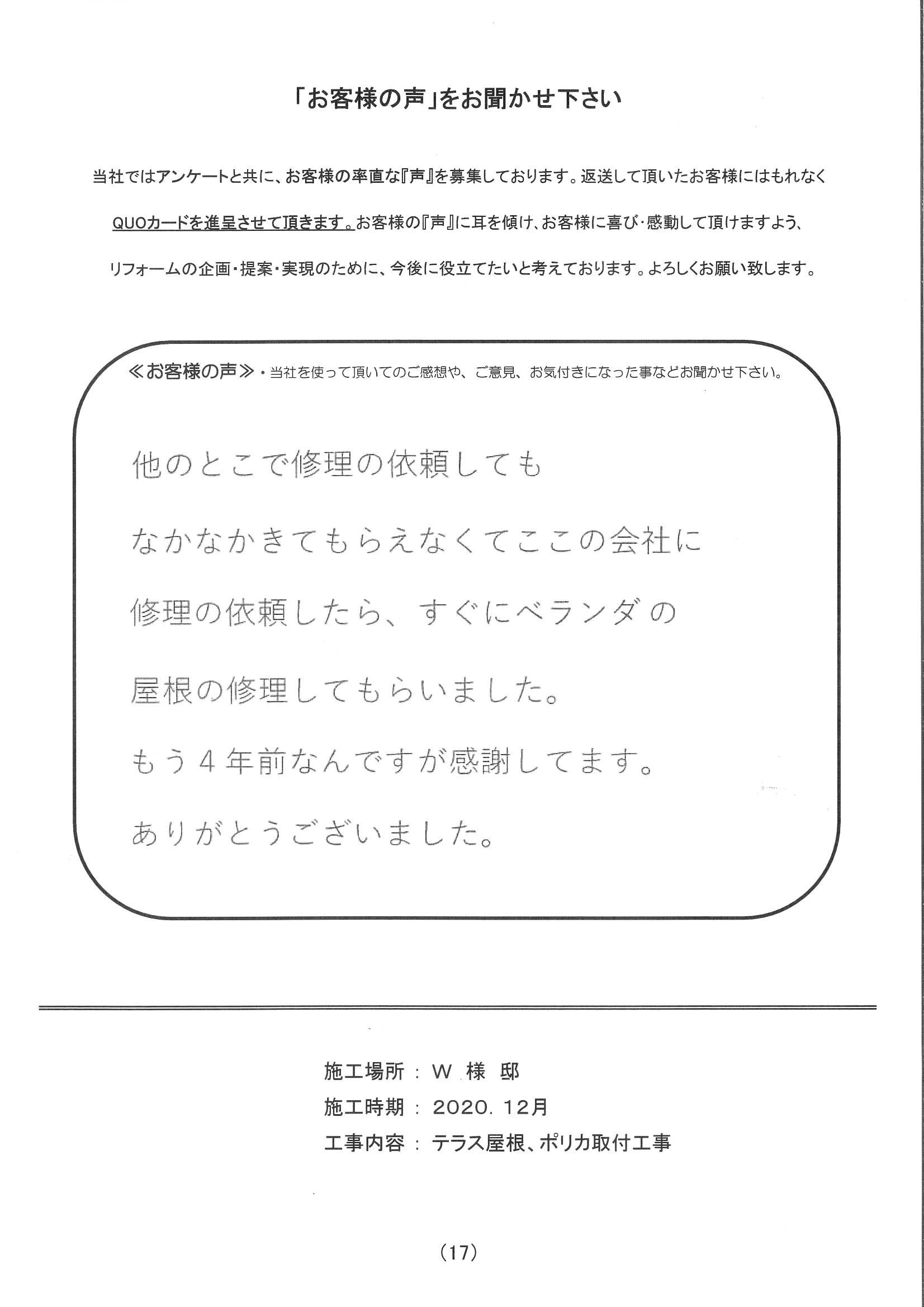他のとこで修理の依頼してもなかなかきてもらえなくてここの会社に修理の依頼したら、すぐにベランダの屋根の修理してもらいました。もう4年前なんですが感謝しています。ありがとうございました。