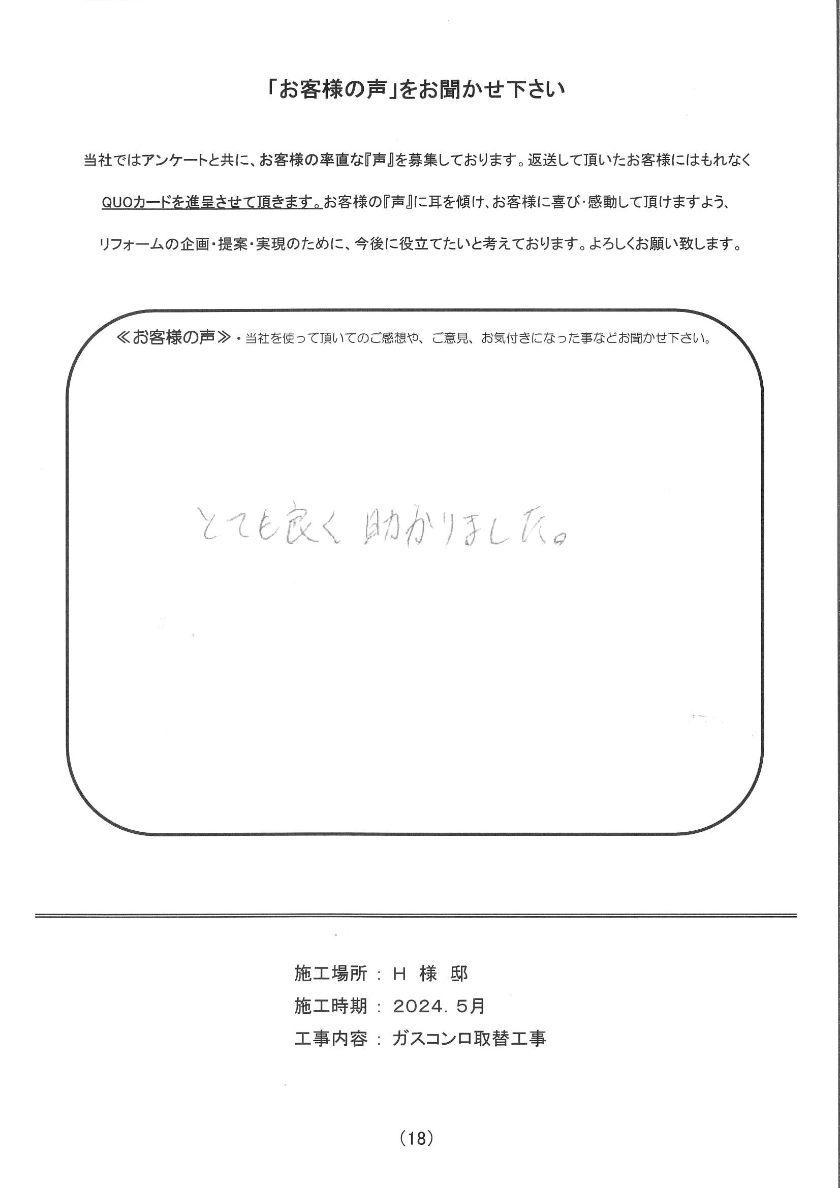 施工場所 H様邸 住宅形態 マンション 施工時期 2024月5月 工事内容 ガスコンロ取替工事