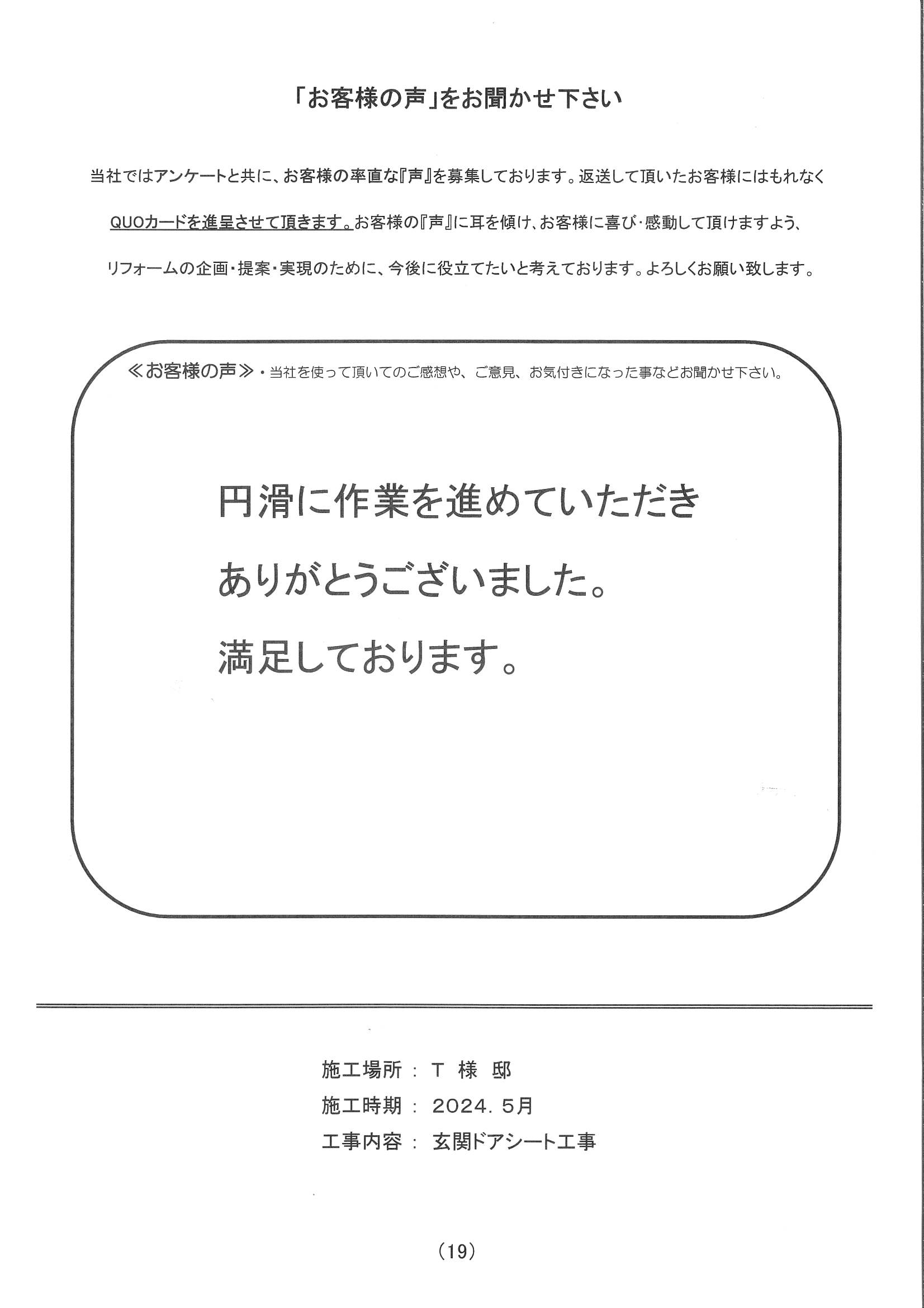 施工場所 T様邸 住宅形態 戸建て 施工時期 2024年5月 工事内容 玄関ドアシート工事