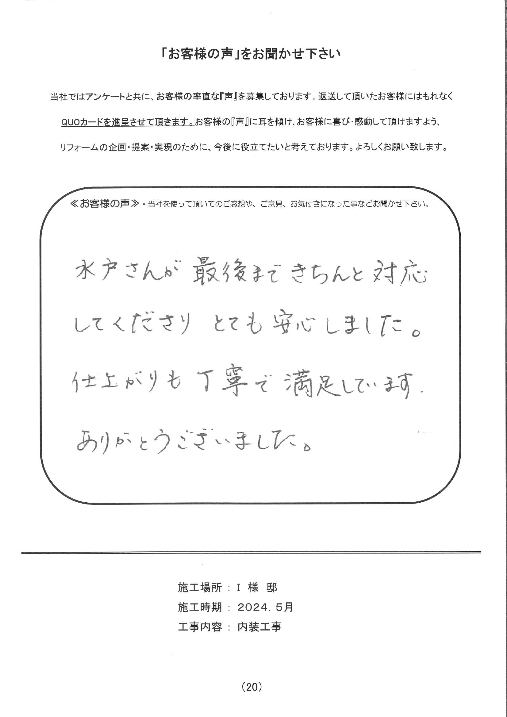水戸さんが最後まできちんと対応してくださりとても安心しました。仕上がりも丁寧で満足しています。ありがとうございました。
