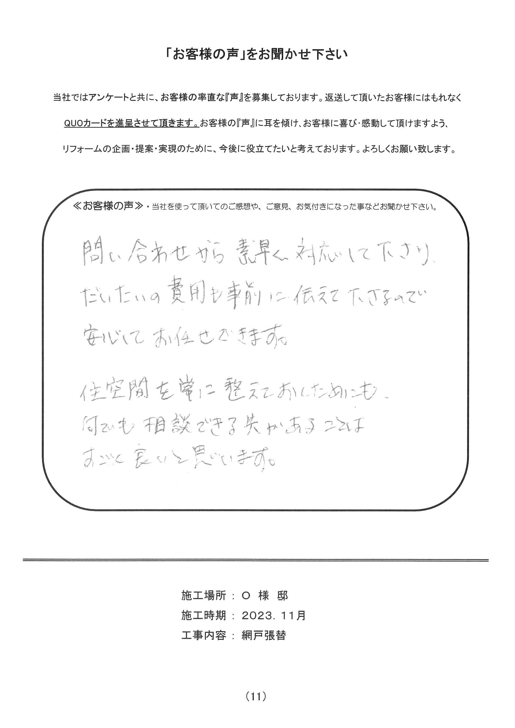 施工場所 O様邸 住宅形態 マンション 施工時期 2023年11月 工事内容 網戸張替