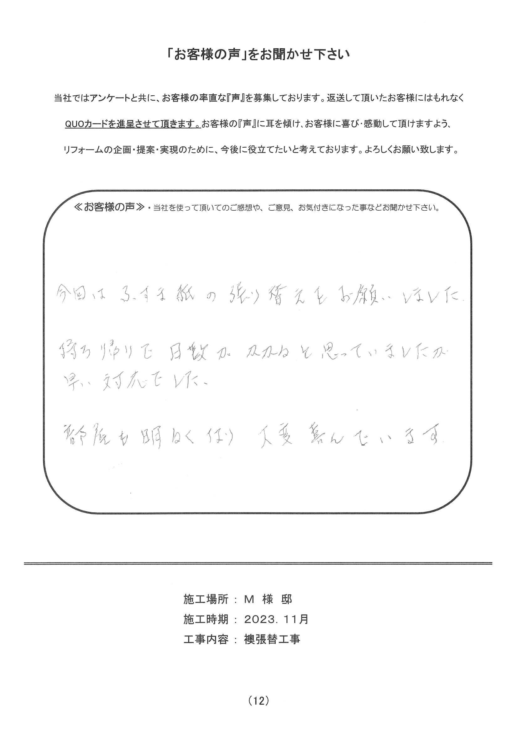 施工場所 M様邸 住宅形態 戸建て 施工時期 2023年11月 工事内容 襖張替工事