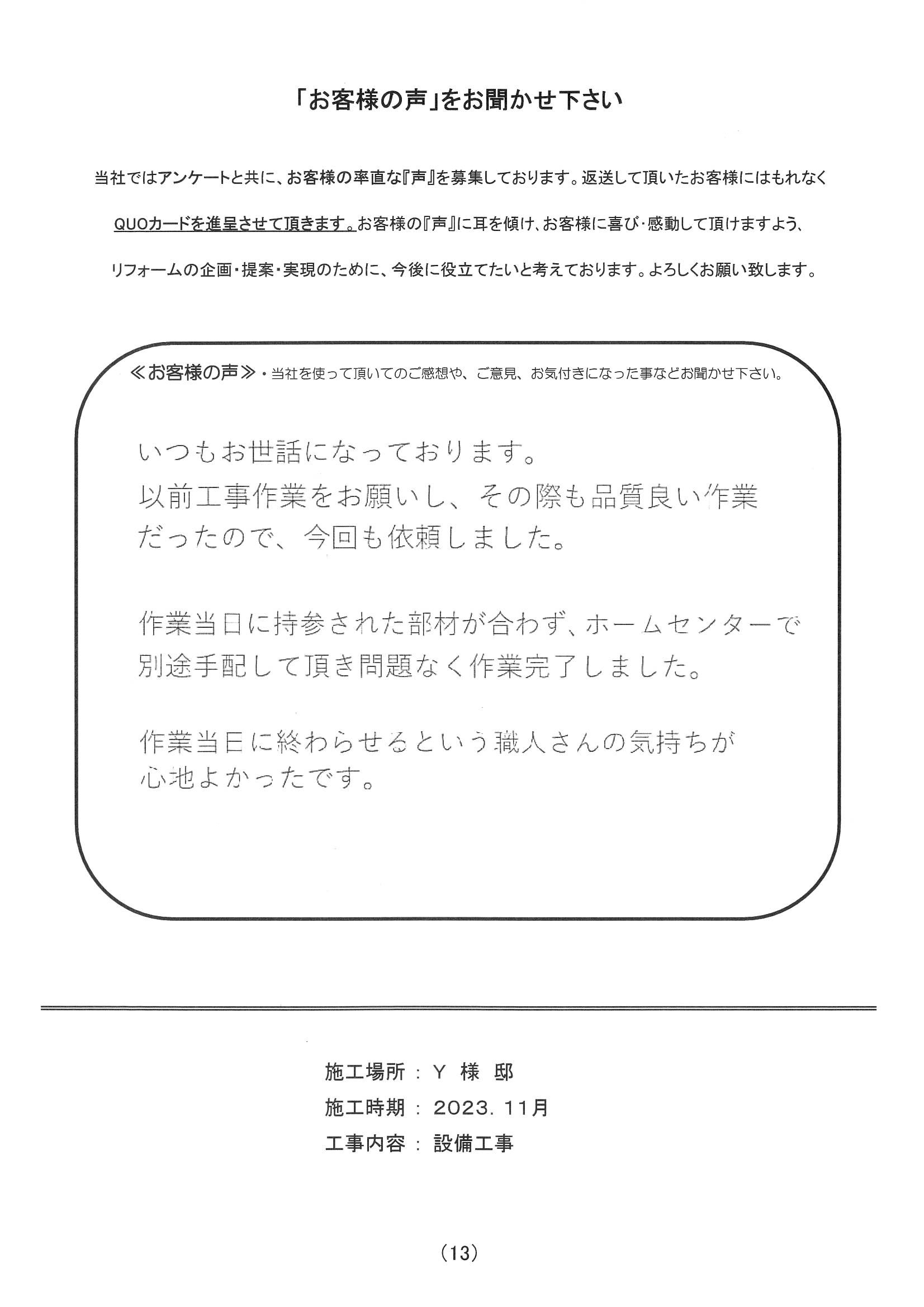施工場所 Y様邸 住宅形態 戸建て 施工時期 2023年11月 工事内容 設備工事