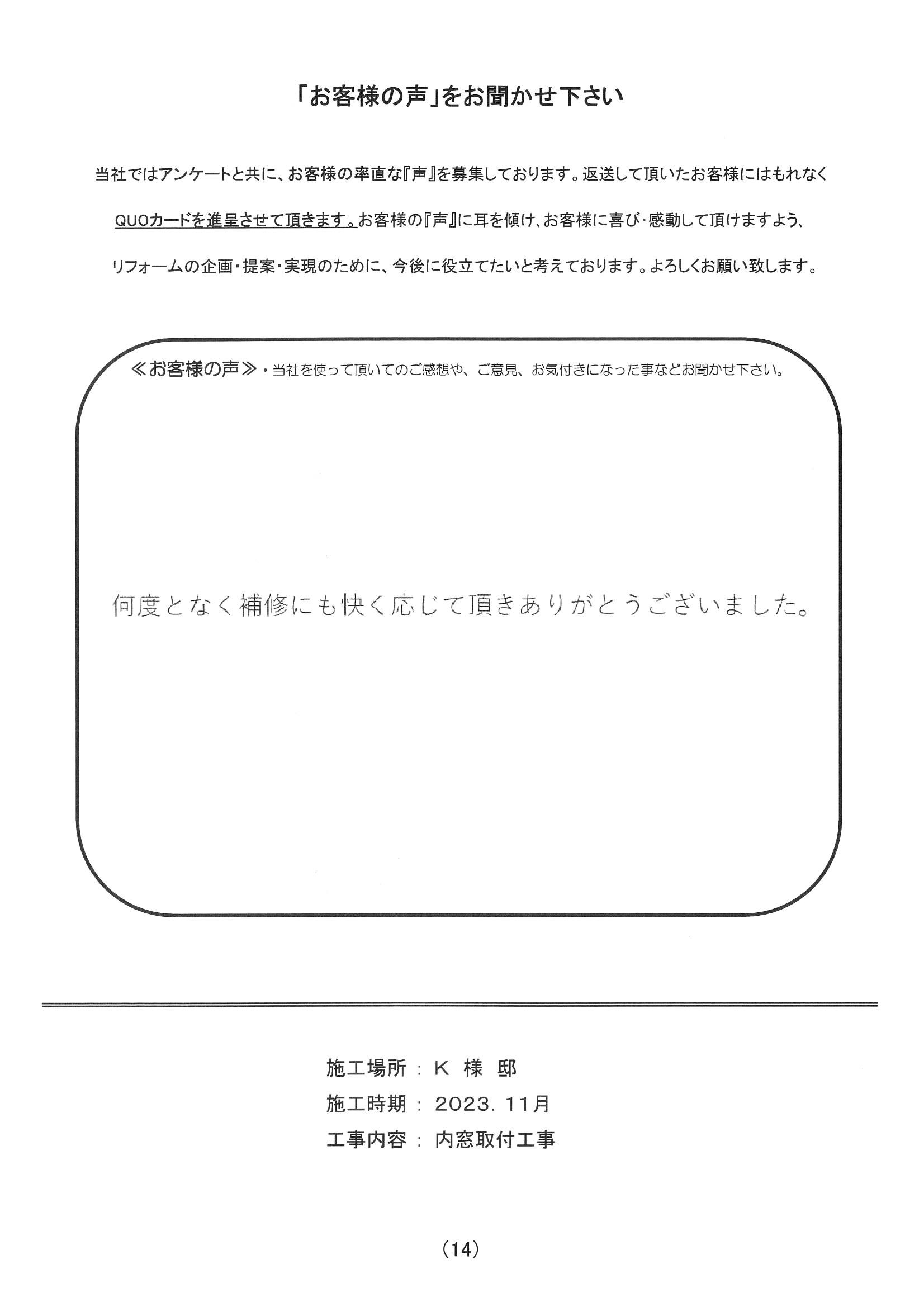 施工場所 K様邸 住宅形態 戸建て 施工時期 2023年11月 工事内容 内窓取付工事