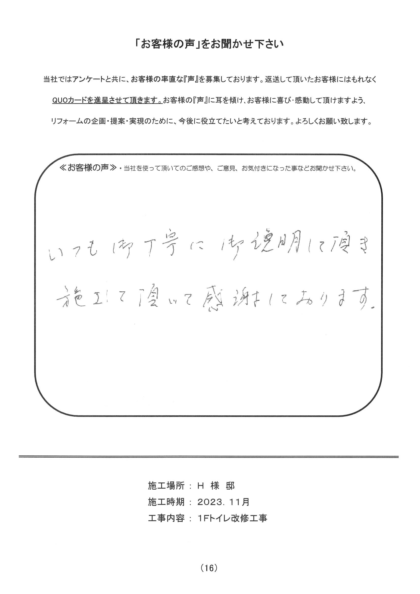 施工場所 H様邸 住宅形態 戸建て 施工時期 2023年11月 工事内容 1Fトイレ改修工事