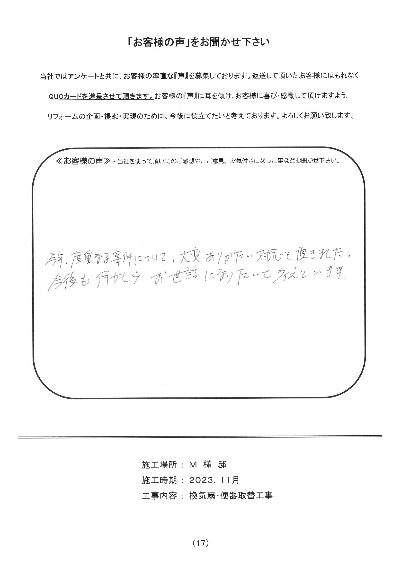 施工場所 M様邸 住宅形態 戸建て 施工時期 2023年11月 工事内容 換気扇・便器取替工事