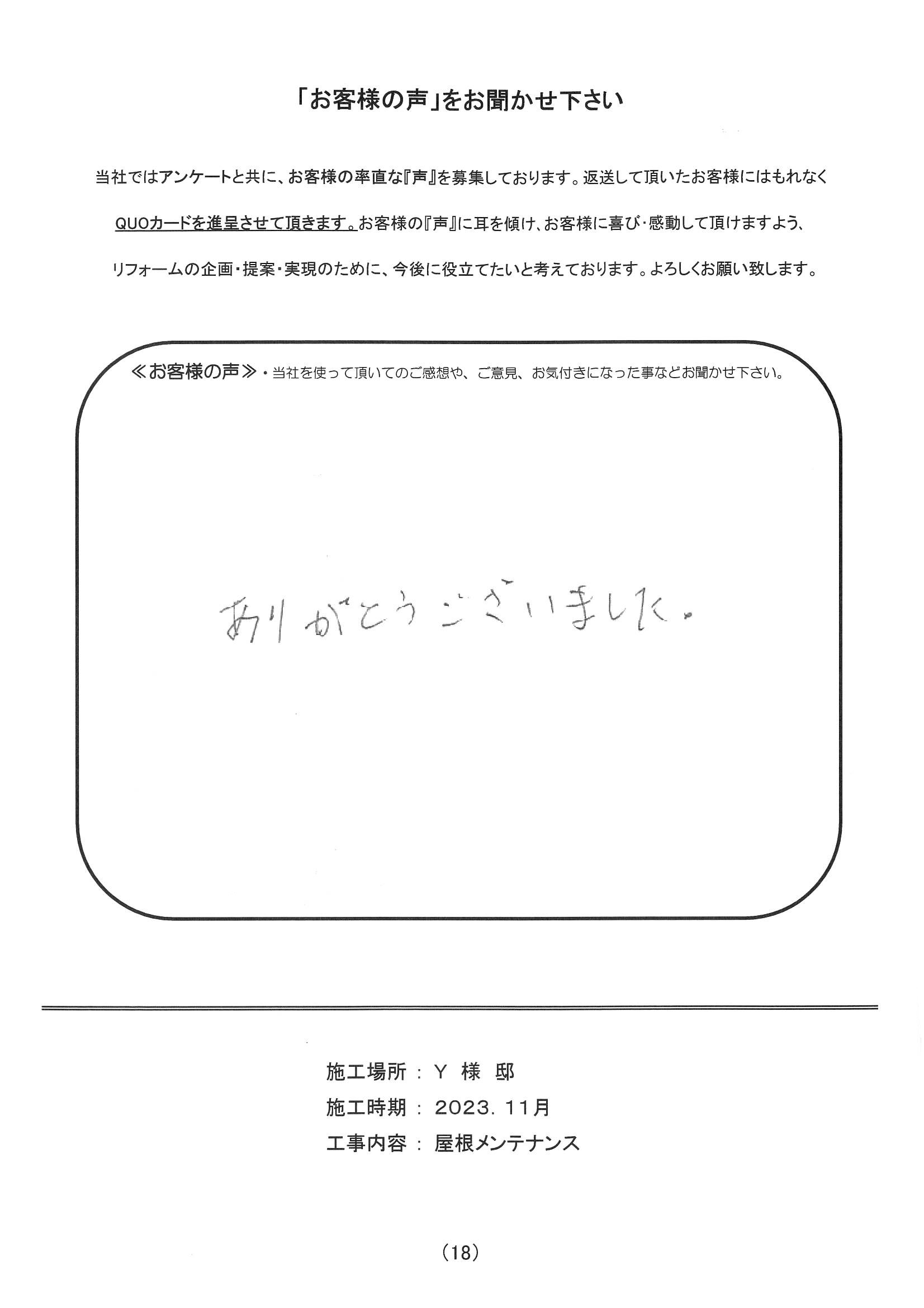 施工場所 Y様邸 住宅形態 戸建て 施工時期 2023年11月 工事内容 屋根メンテナンス