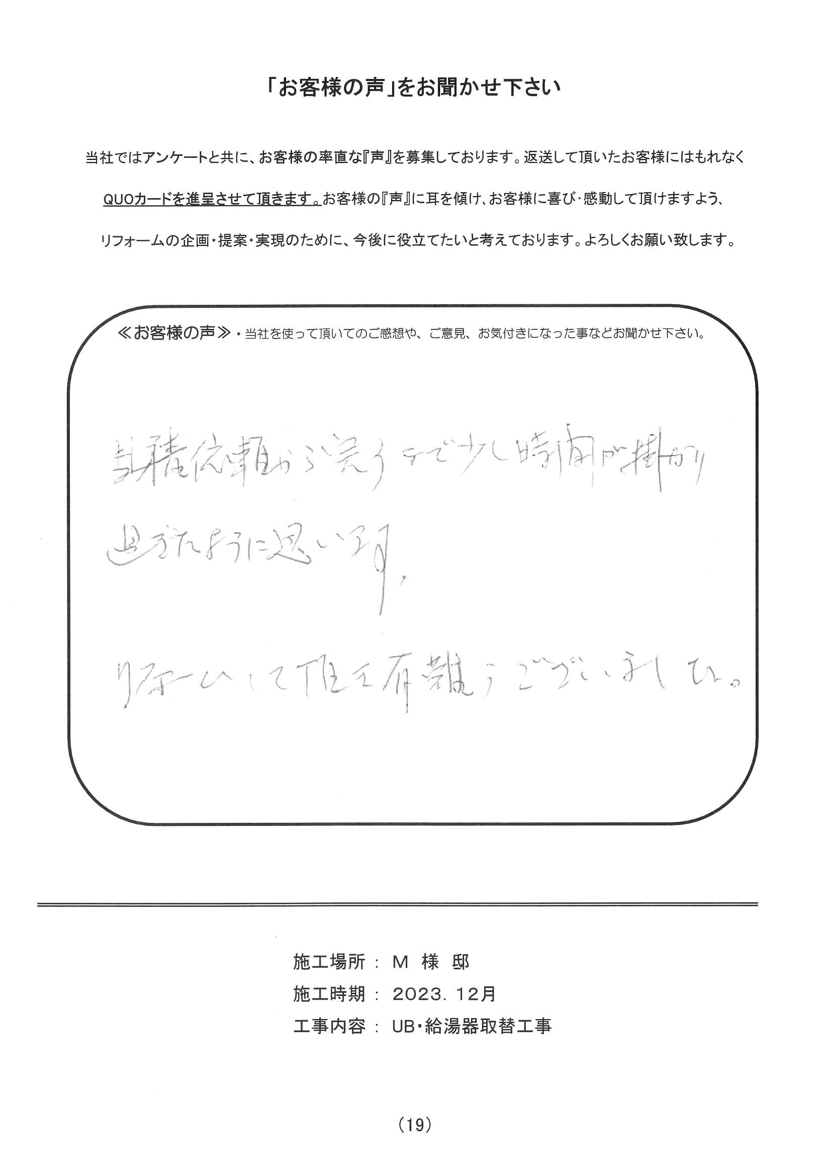 見積依頼から完了まで少し時間が掛かり過ぎたように思います。リフォームして頂き有難うございました。