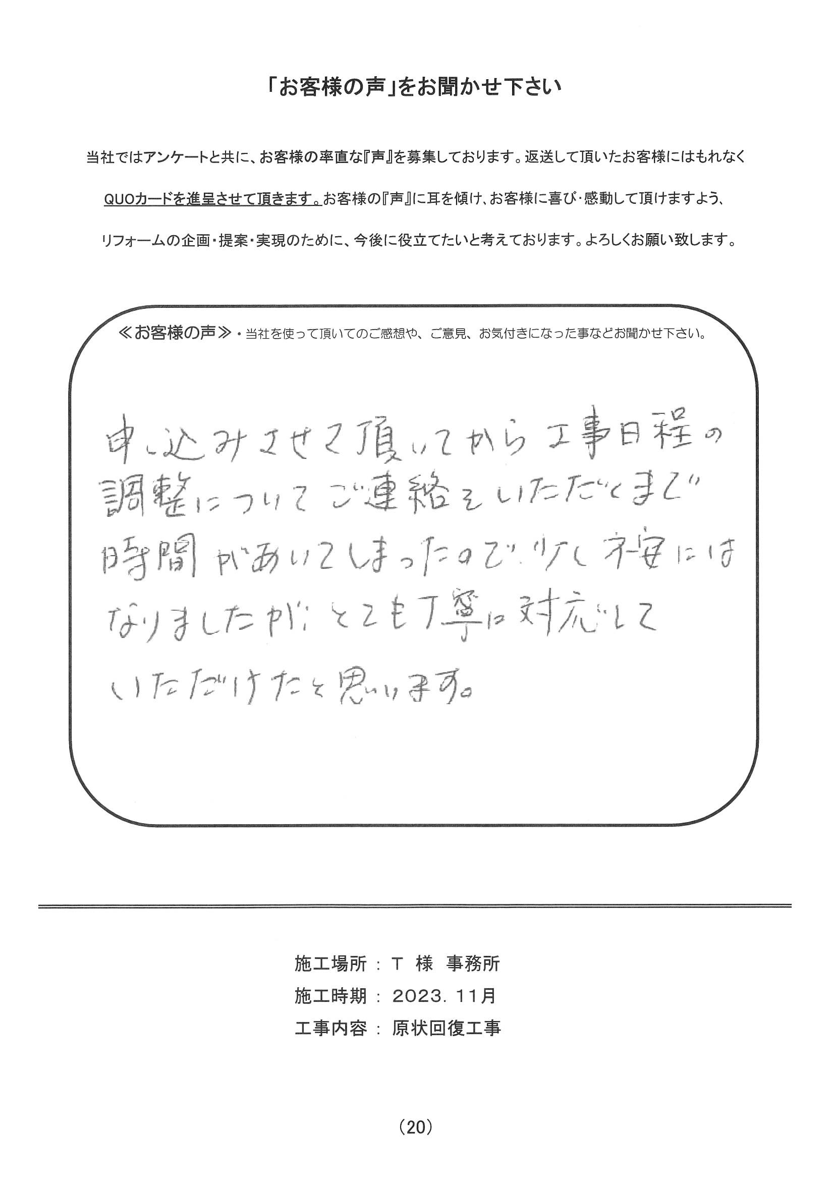 施工場所 T様事務所 住宅形態 ビル 施工時期 2023年11月 工事内容 原状回復工事
