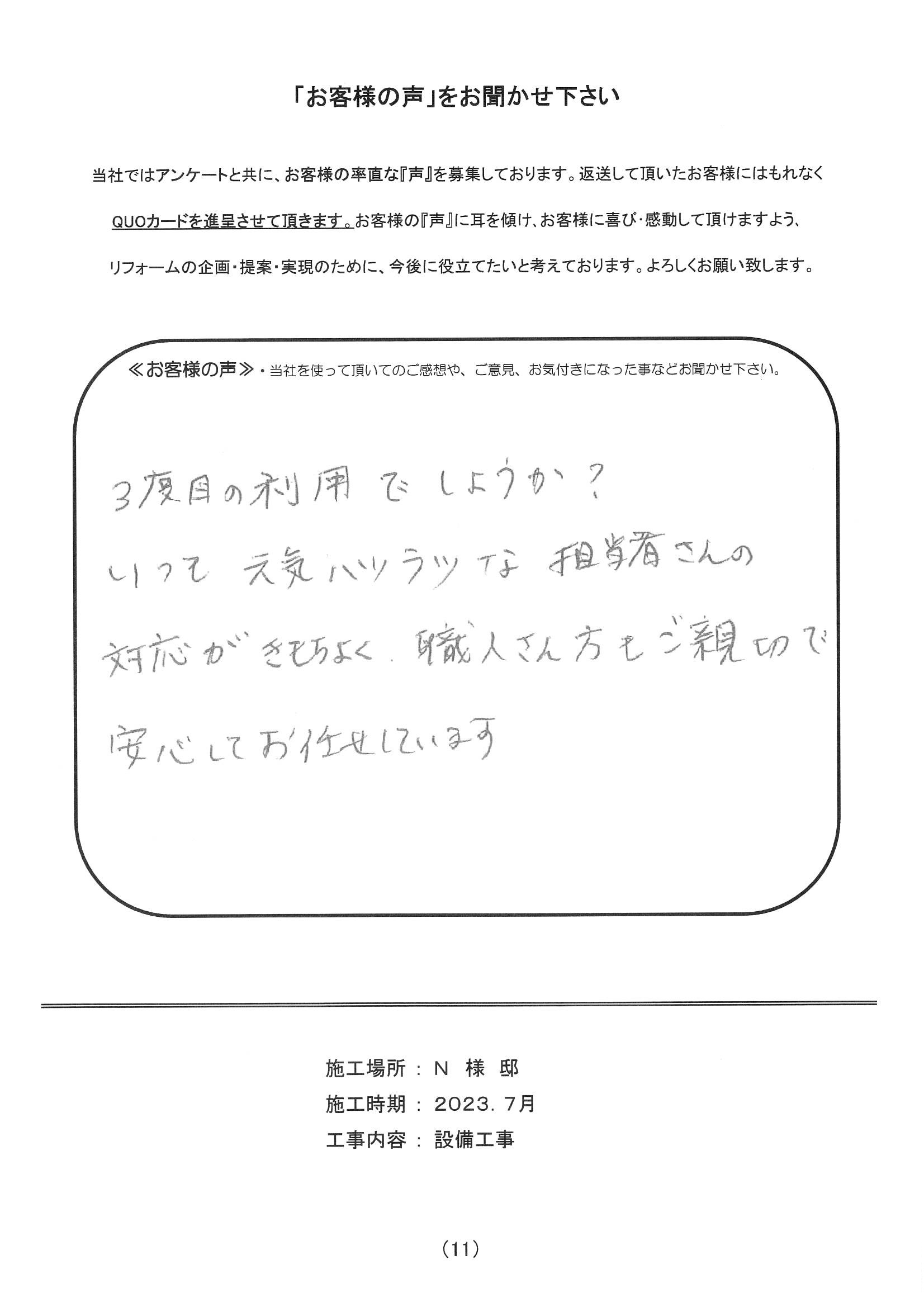 3度目の利用でしょうか?いつも元気ハツラツな担当者さんの対応がきもちよく、職人さん方もご親切で安心してお任せしています。