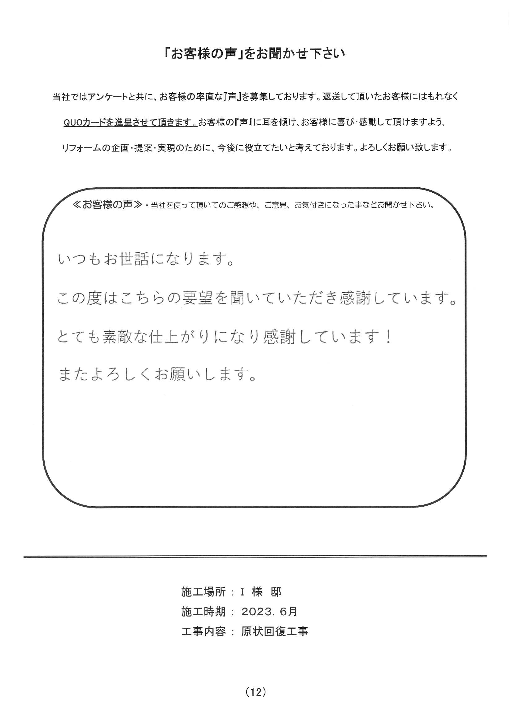 施工場所 I様邸 住宅形態 マンション 施工時期 2023年6月 工事内容 原状回復工事