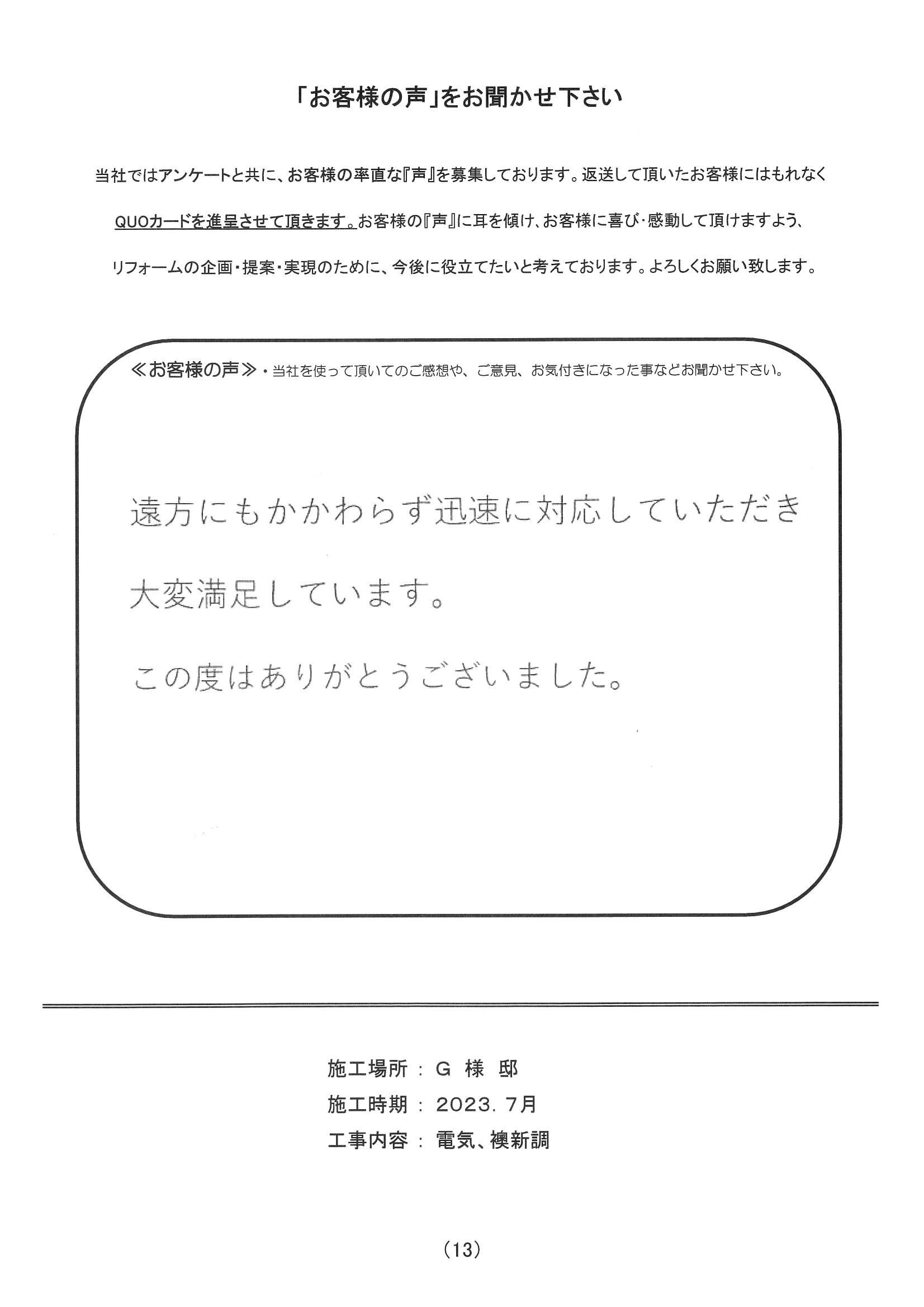 遠方にもかかわらず迅速に対応していただき大変満足しています。この度はありがとうございました。