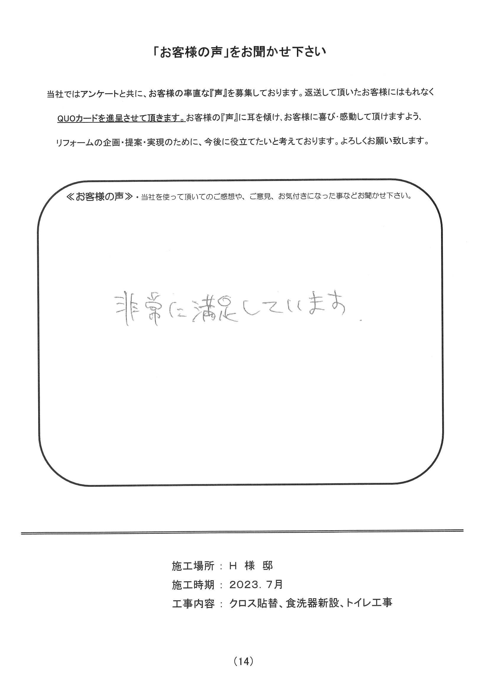 施工場所 H様邸 住宅形態 マンション 施工時期 2023年7月 工事内容 クロス貼替、食洗器新設、トイレ工事