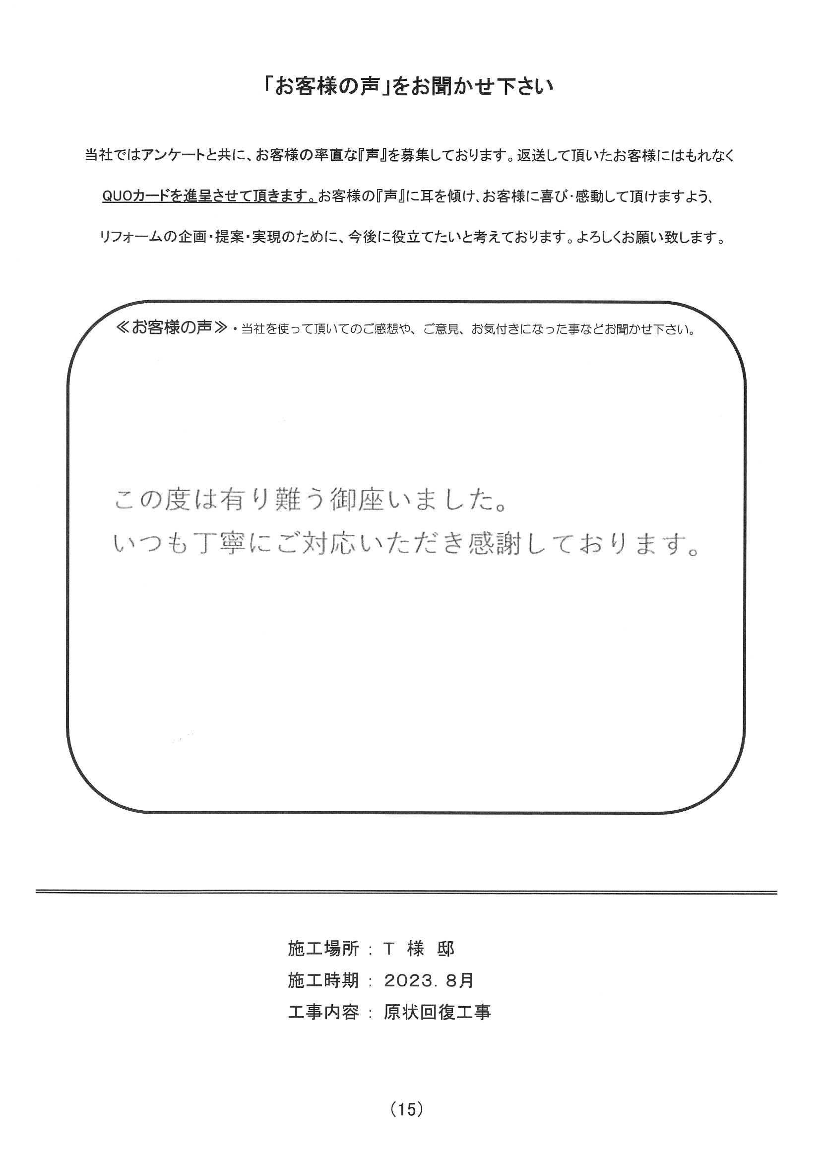 施工場所 T様邸 住宅形態 マンション 施工時期 2023年8月 工事内容 原状回復工事