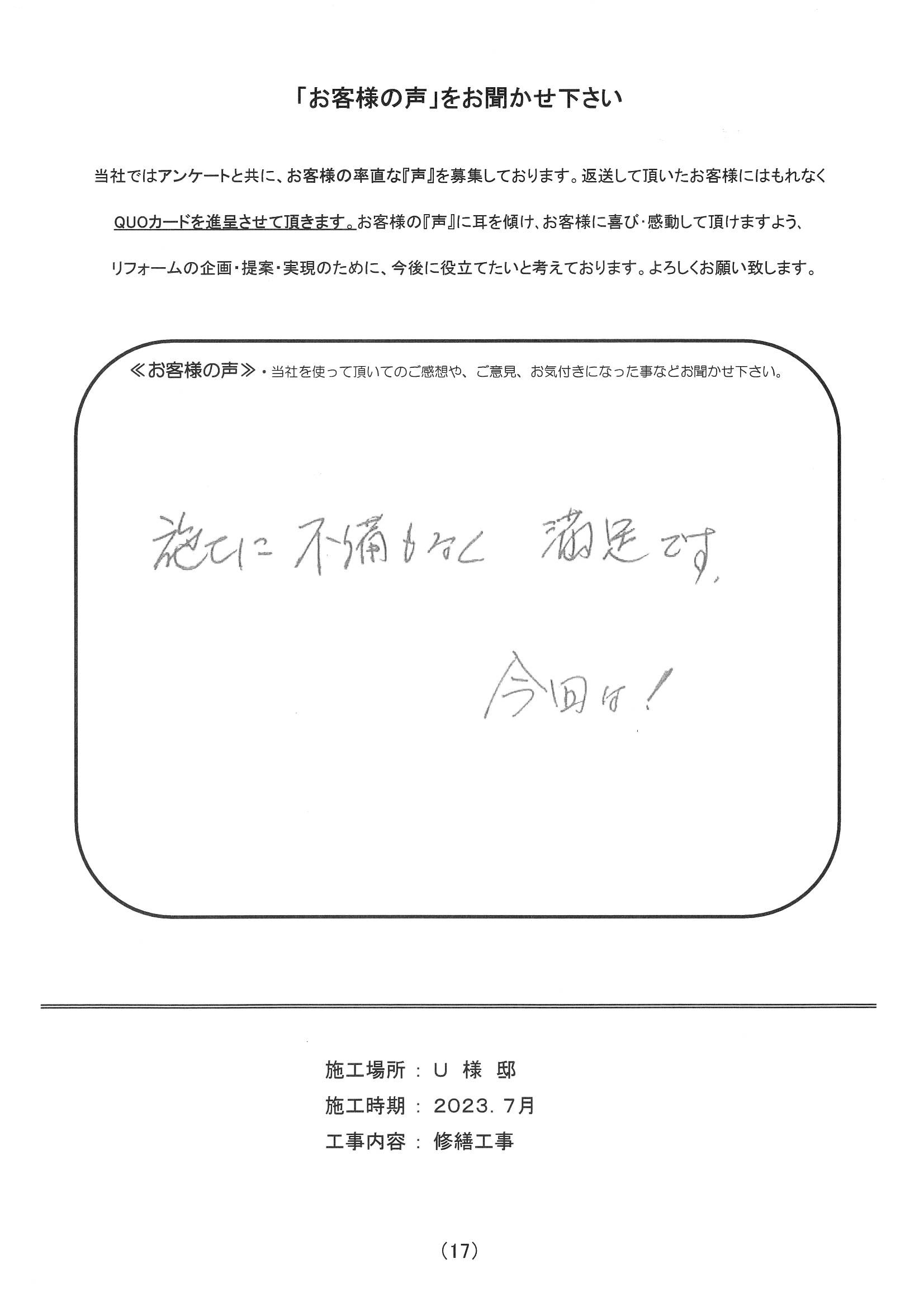 施工場所 U様邸 住宅形態 マンション 施工時期 2023年7月 工事内容 修繕工事
