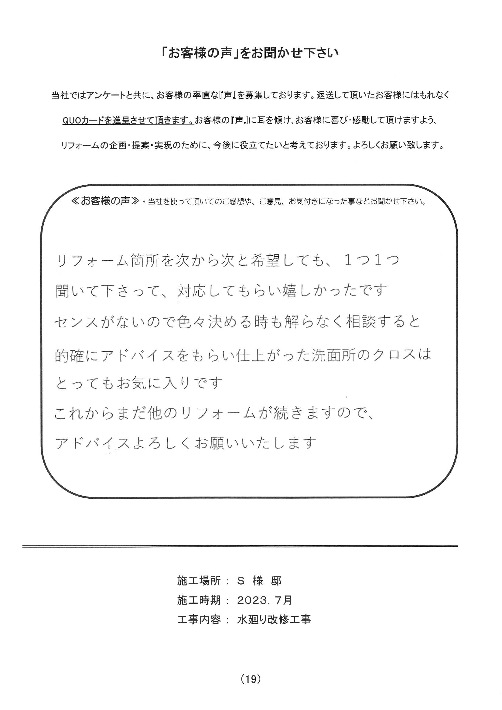リフォーム箇所を次から次と希望しても、1つ1つ聞いて下さって、対応してもらい嬉しかったです。センスがないので色々決める時も解らなく相談すると的確にアドバイスをもらい仕上がった洗面所のクロスはとってもお気に入りです。これからまだ他のリフォームが続きますので、アドバイスよろしくお願いいたします。