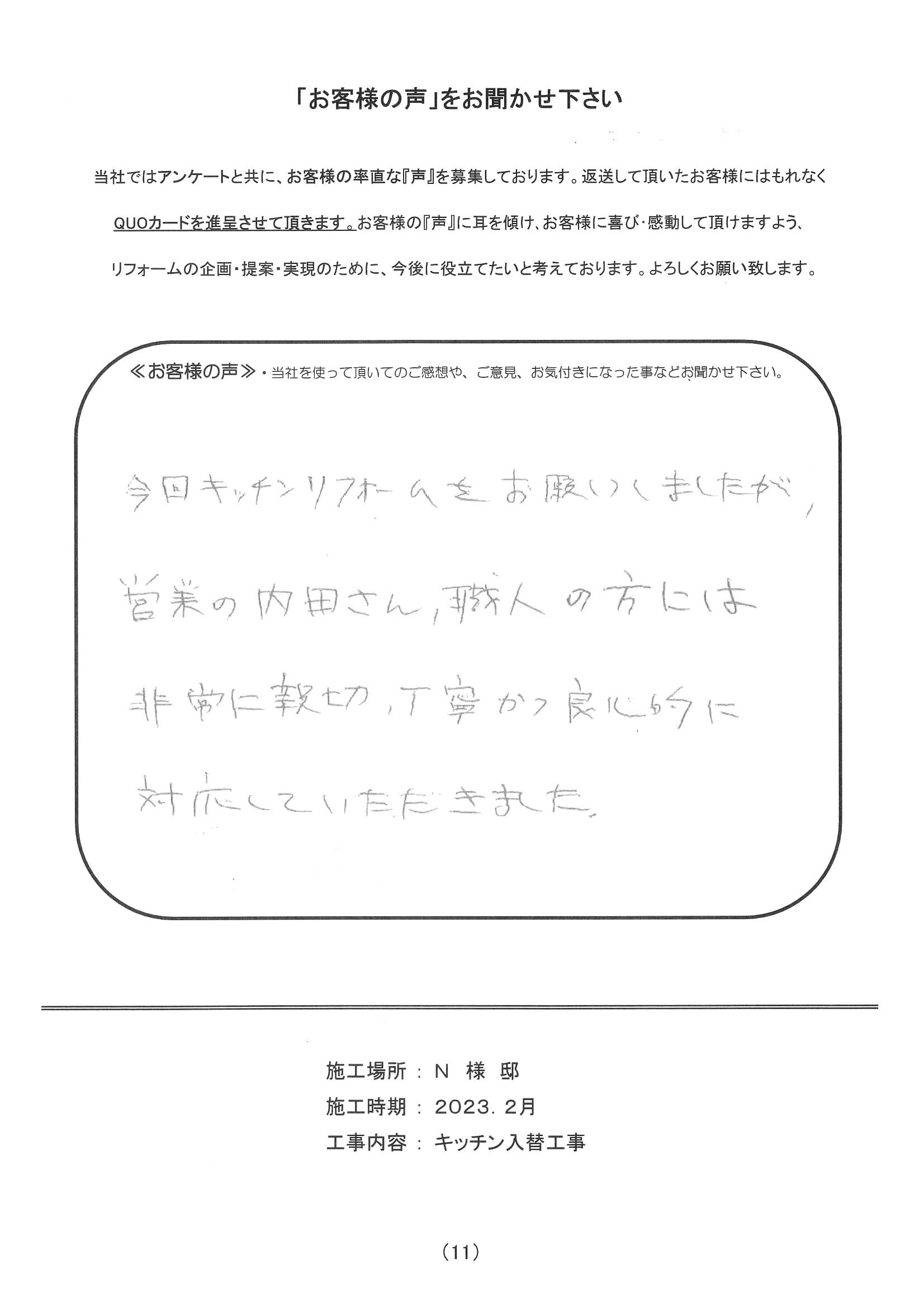 今回キッチンリフォームをお願いしましたが、営業の内田さん、職人の方には非常に親切、丁寧かつ良心的に対応していただきました。