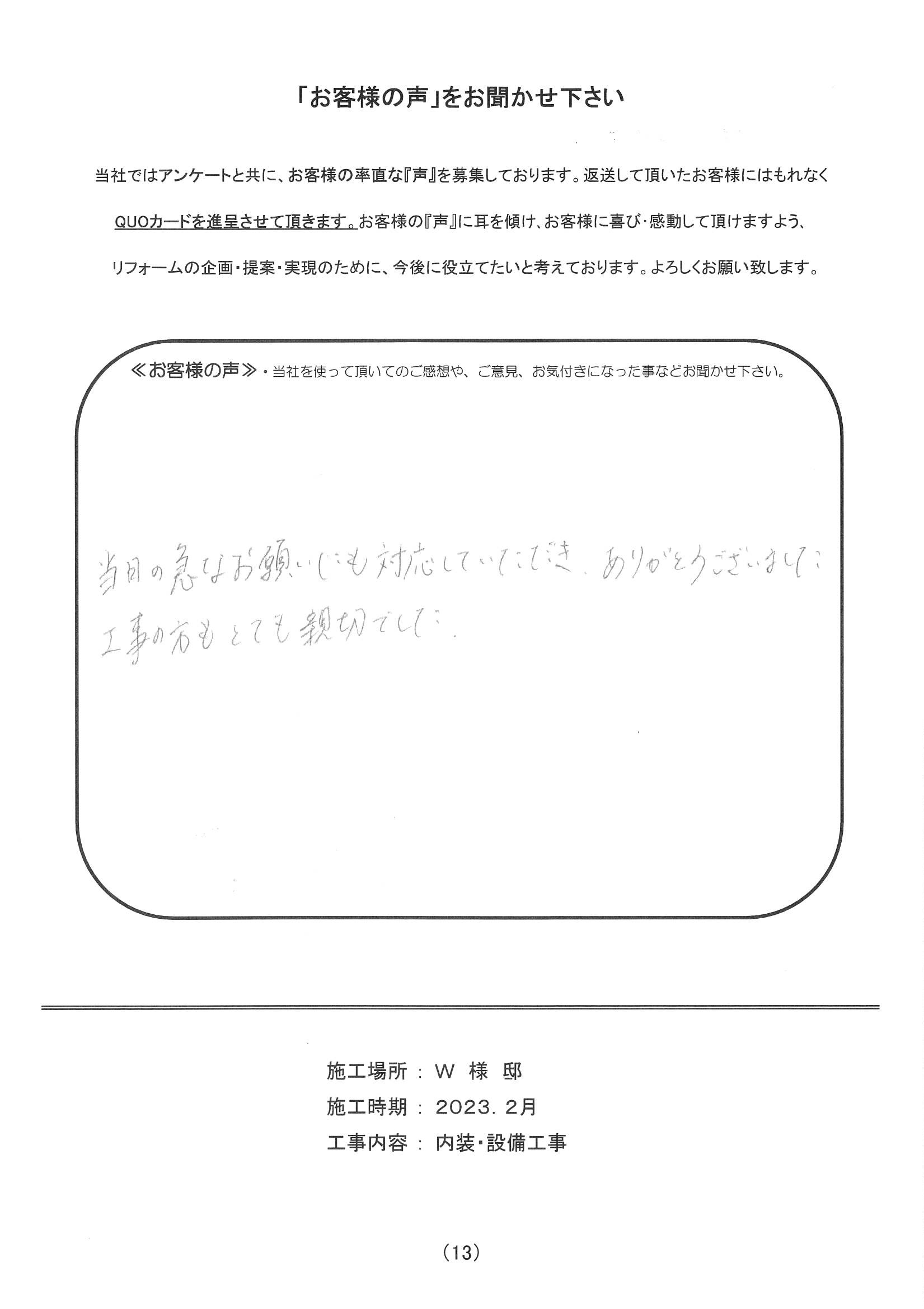 当日の急なお願いにも対応していただき、ありがとうございました。工事の方もとても親切でした。