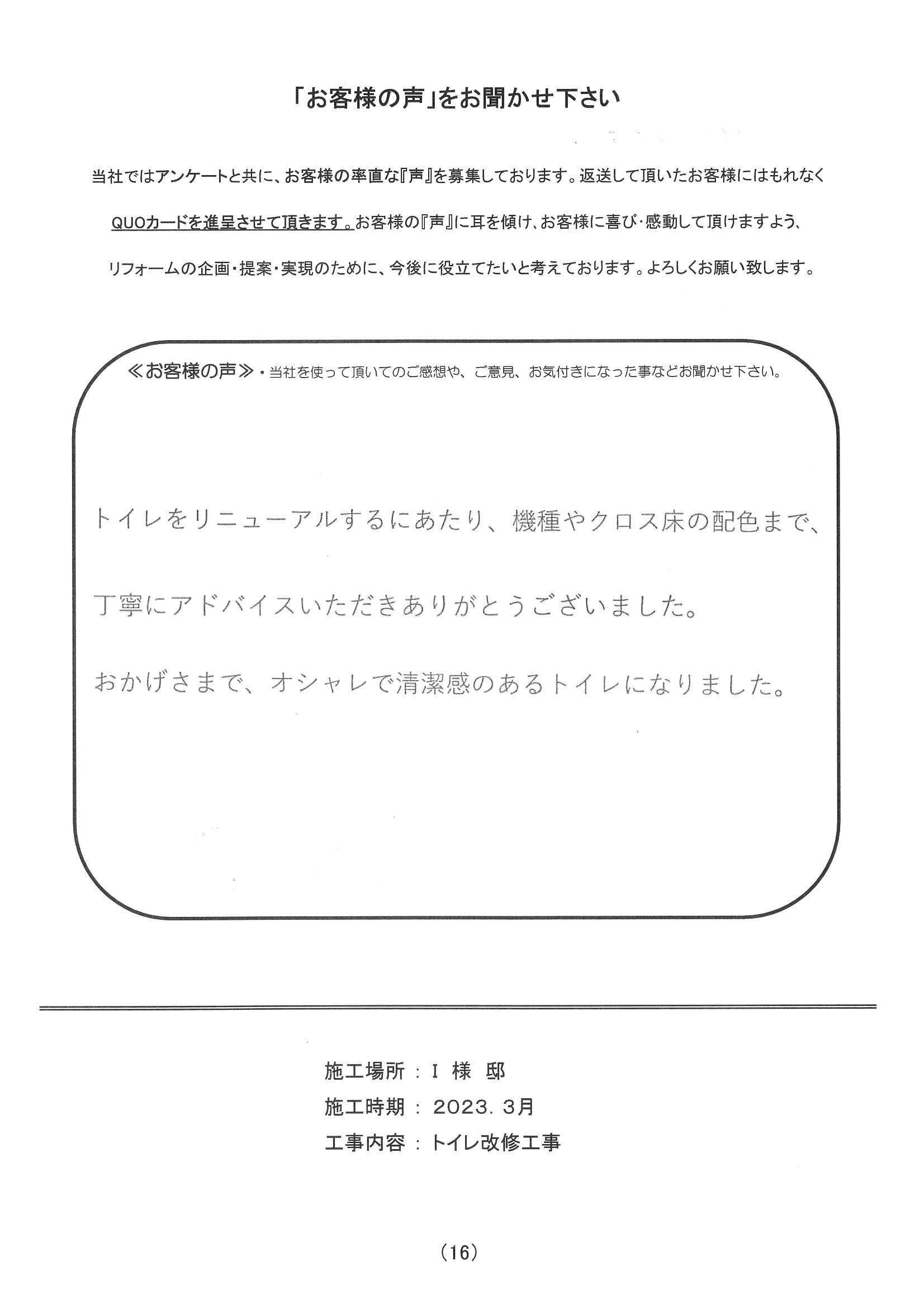 トイレをリニューアルするにあたり、機種やクロス床の配色まで、丁寧にアドバイスいただきありがとうございました。おかげさまで、オシャレで清潔感のあるトイレになりました。