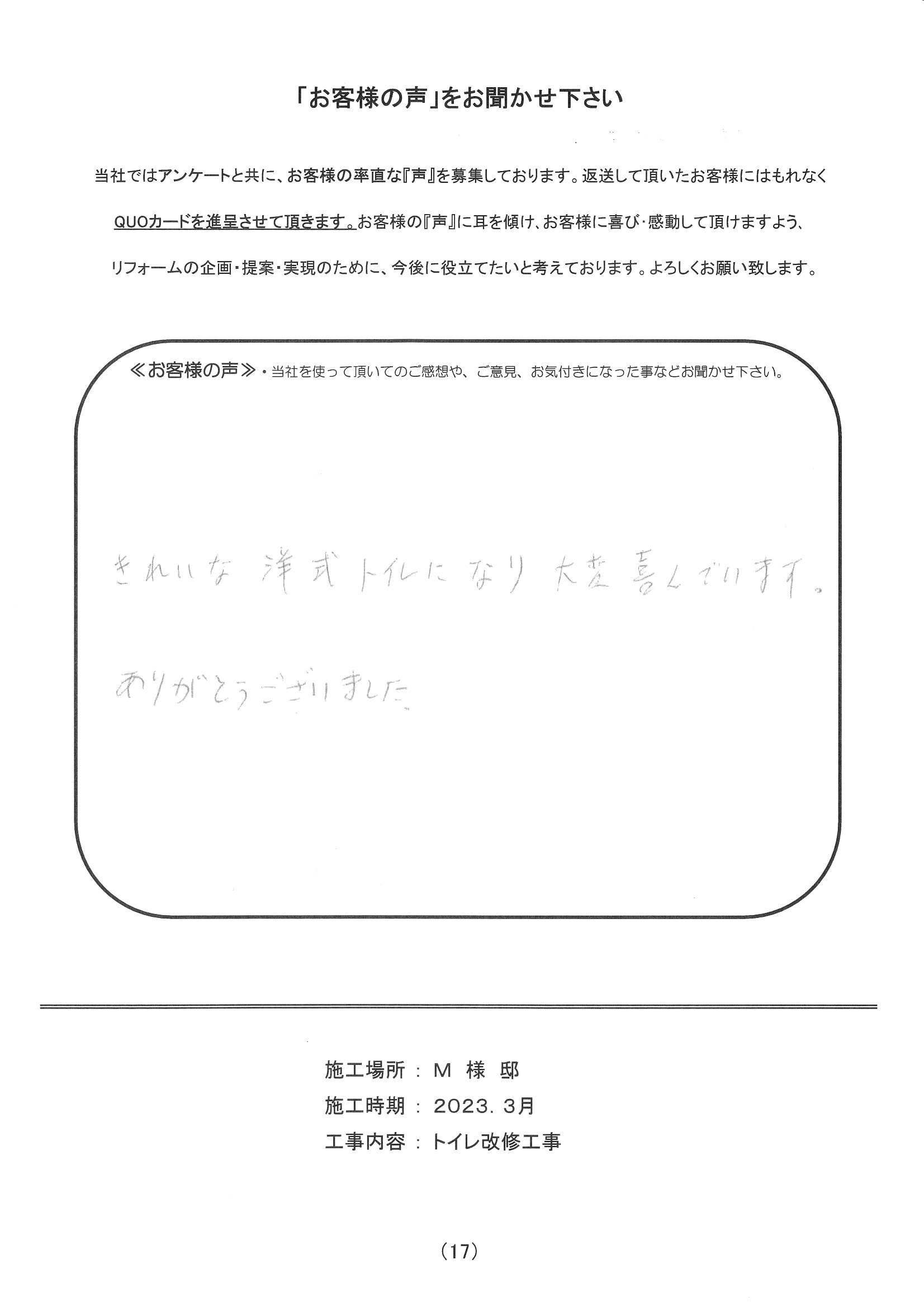 きれいな洋式トイレになり大変喜んでいます。ありがとうございました。